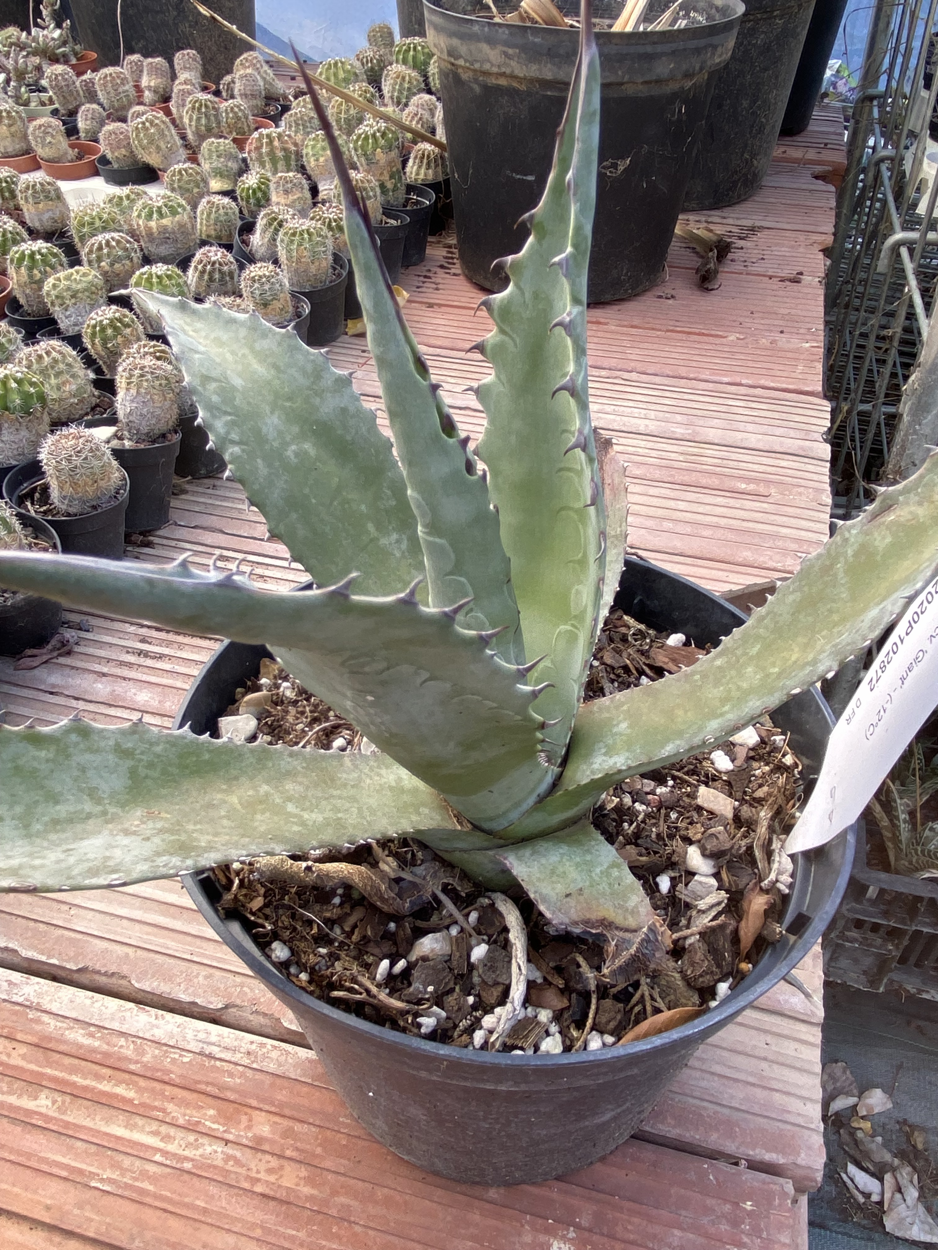 Cette variété 'Giant' se distingue par sa taille imposante : elle devient rapidement la pièce maîtresse d’un massif sec, d’un talus aride ou d’un grand bac sur une terrasse bien ensoleillée. Sa silhouette en rosette architecturale met en valeur les espaces minéraux, les rocailles et les jardins contemporains, tout en apportant une touche exotique et lumineuse.