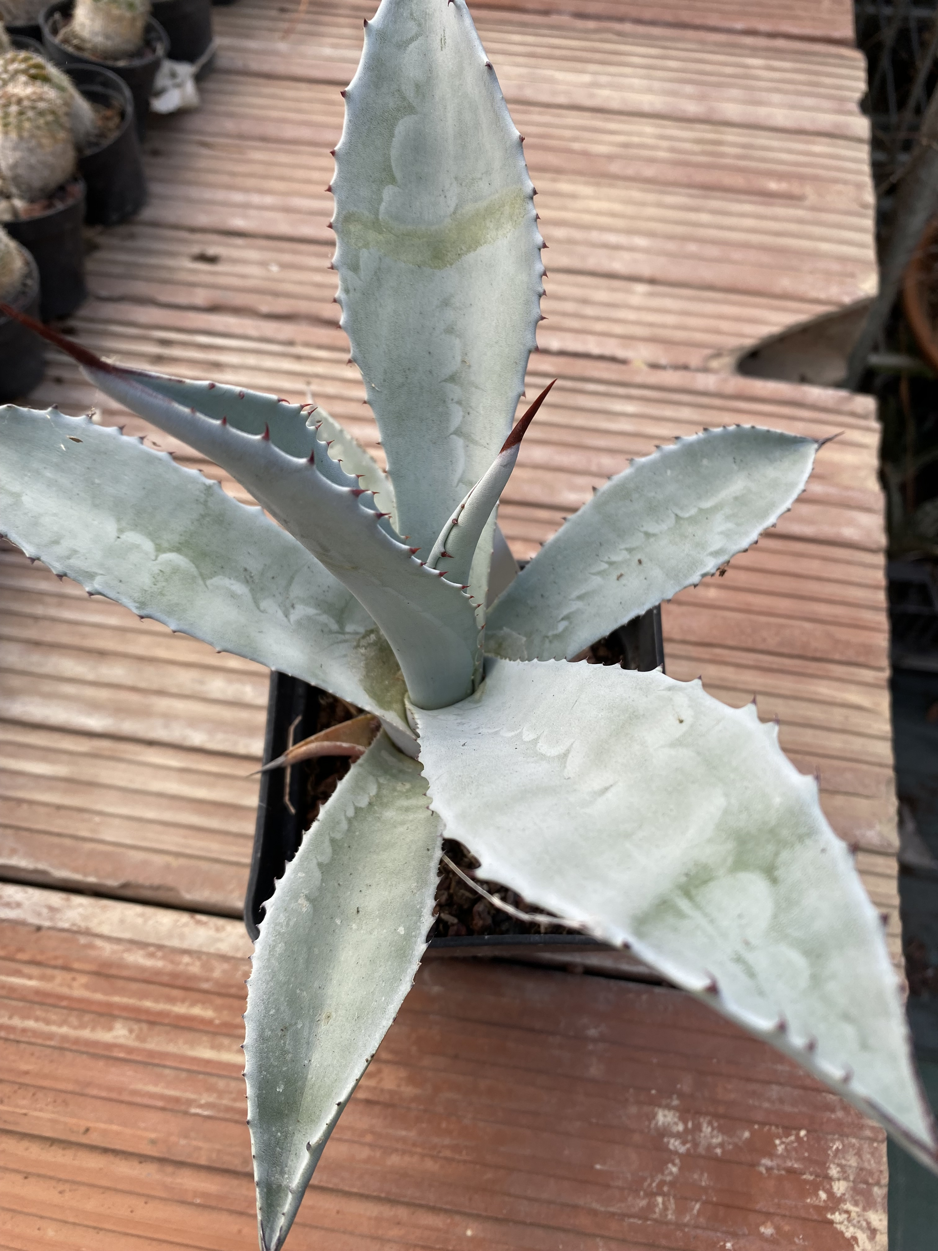 Cette agave forme une large rosette très structurante qui attire immédiatement le regard. Son feuillage persistant, charnu, disposé en rosette serrée, se teinte souvent de gris-bleuté à bleu-vert selon l’exposition et le type de sol. La plante met de longues années avant de fleurir, et cette floraison reste rare en culture courante.