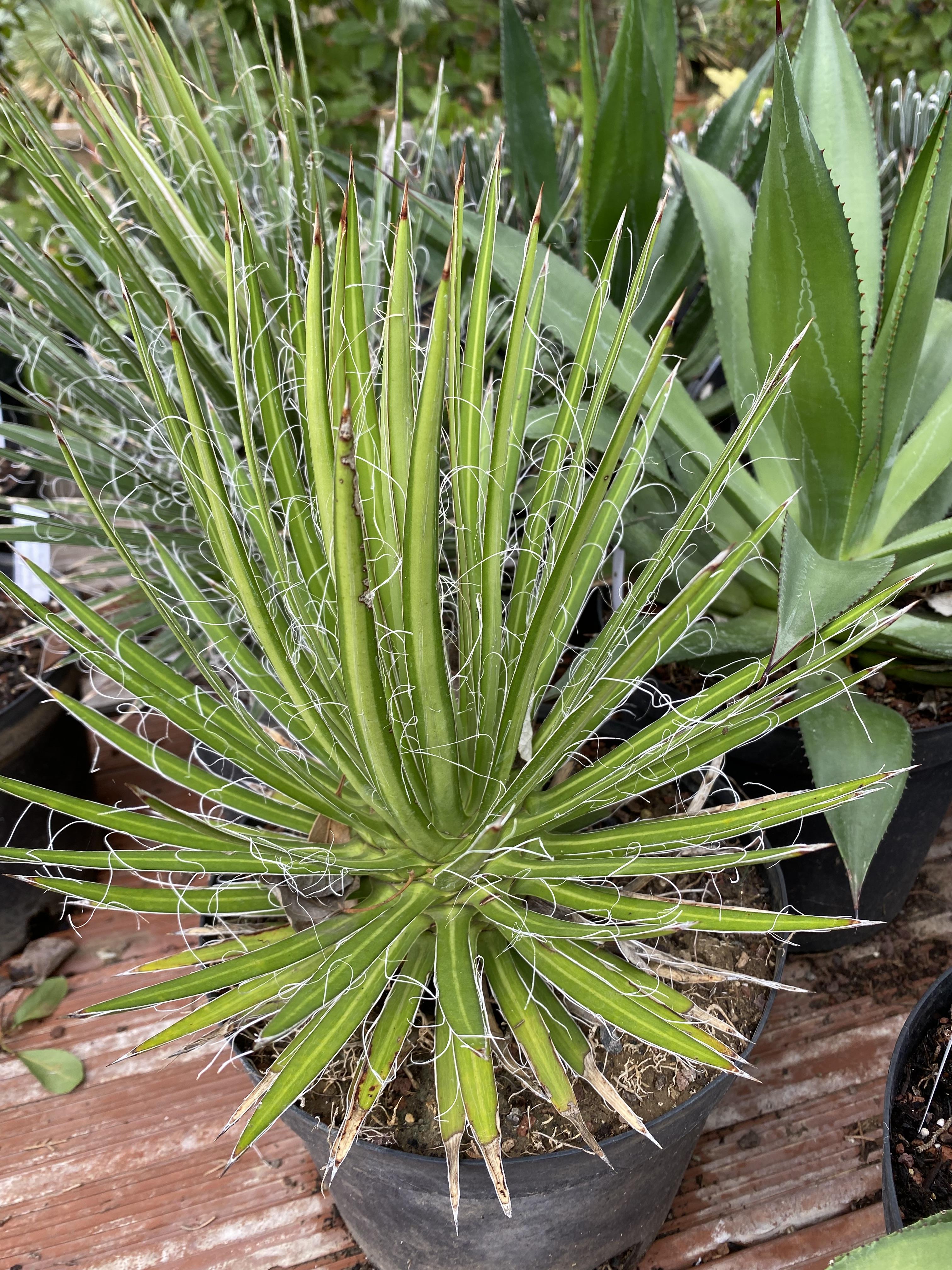 En climat froid et humide, il est plus prudent de cultiver l’Agave multifilifera en grand pot afin de pouvoir la mettre à l’abri des pluies hivernales prolongées, sous un auvent, une véranda ou toute structure protégée, tout en lui offrant une luminosité maximale.