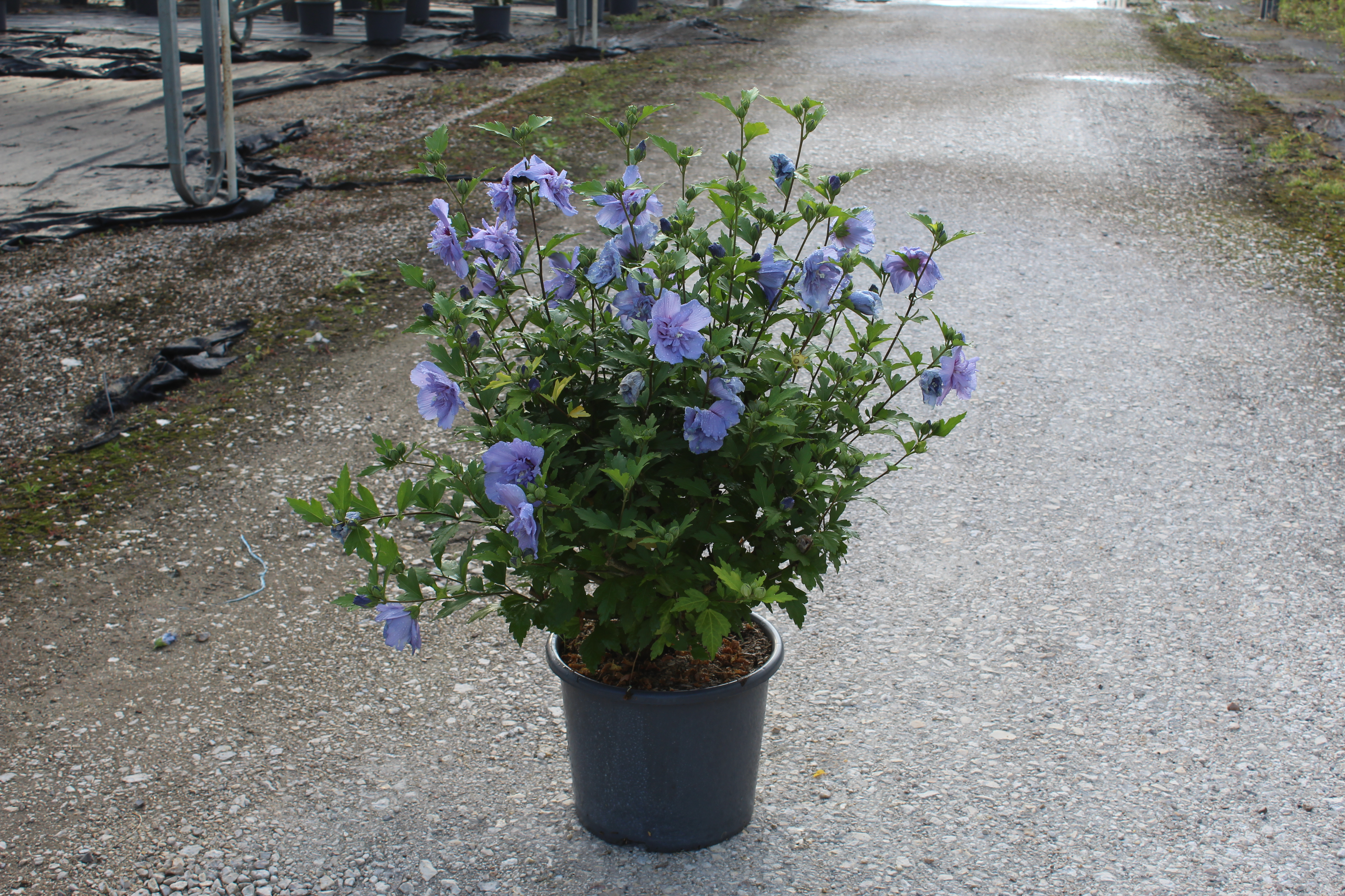 Pour garantir le bon développement de votre Althéa 'Blue Chiffon', choisissez un emplacement en plein soleil, idéalement avec 6 à 8 heures de lumière directe par jour. Vous pouvez également le planter en mi-ombre, mais cela peut légèrement affecter la floraison. Un sol léger à moyen, riche en humus et bien drainé est essentiel.