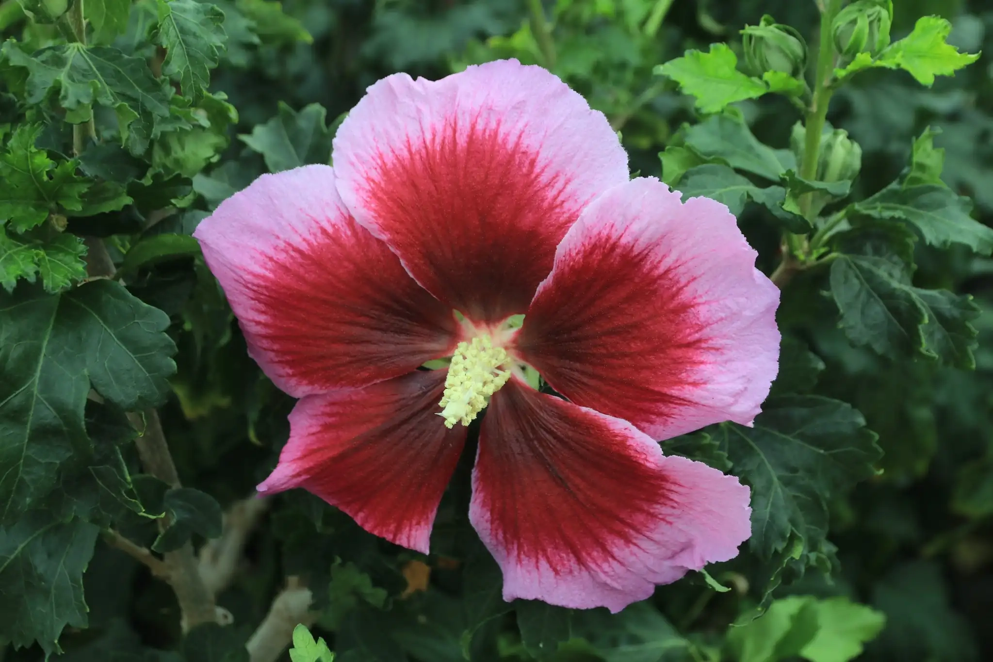 L'Hibiscus 'Cocktail' se suffit presque à lui-même tant il offre un spectacle complet :