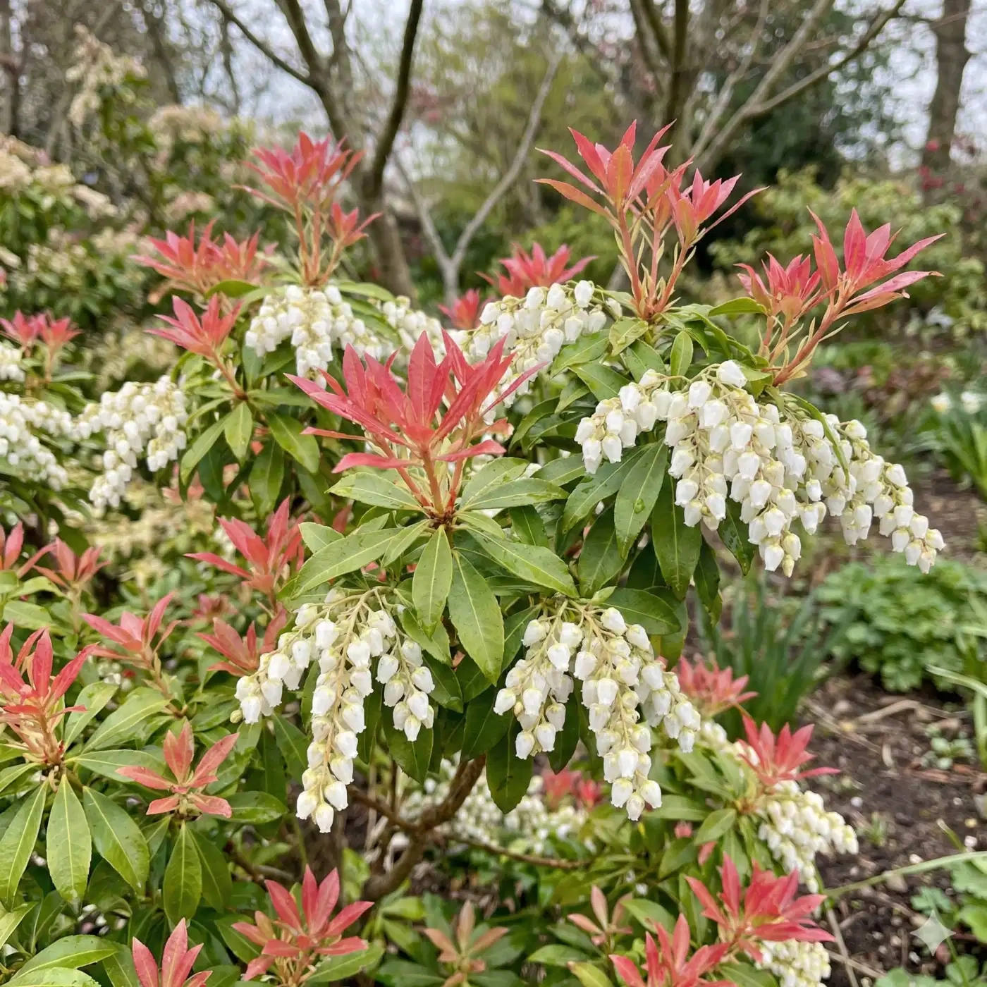 L'Andromède du Japon 'Forest Flame' (Pieris japonica 'Forest Flame') est un arbuste d'ornement incontournable qui offre un spectacle visuel saisissant et évolutif. Dès le début du printemps (mars-avril), il dévoile une floraison très généreuse sous forme de longues grappes retombantes composées de ravissantes clochettes blanches, semblables à du muguet. Presque simultanément, ses jeunes pousses font leur apparition dans un rouge écarlate flamboyant et particulièrement lumineux.