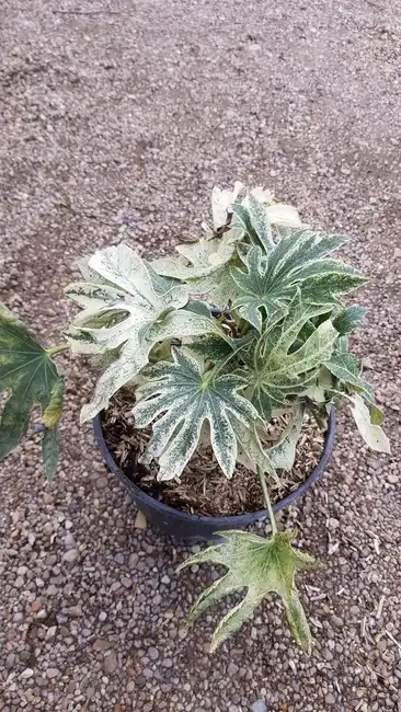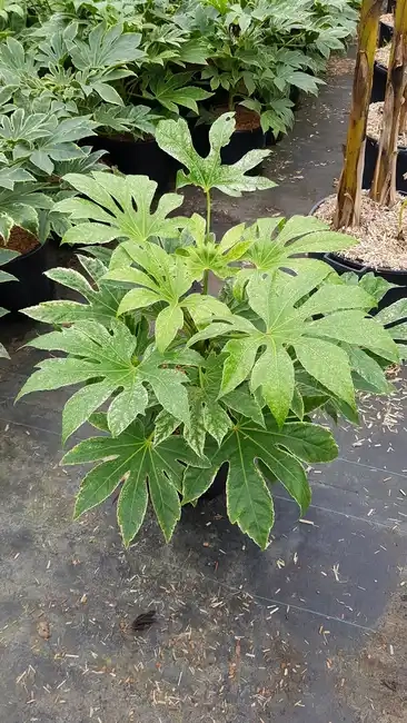 Le Fatsia japonica 'Spider's Web' est une variété d'Aralia du Japon absolument spectaculaire, plébiscitée par les paysagistes pour son allure exotique et lumineuse. Il se distingue par ses immenses feuilles palmées, finement éclaboussées et mouchetées de blanc crème, donnant l'illusion d'une fine toile d'araignée ou d'un givre permanent. Ce panachage évolue au fil des saisons, rendant chaque feuille unique.