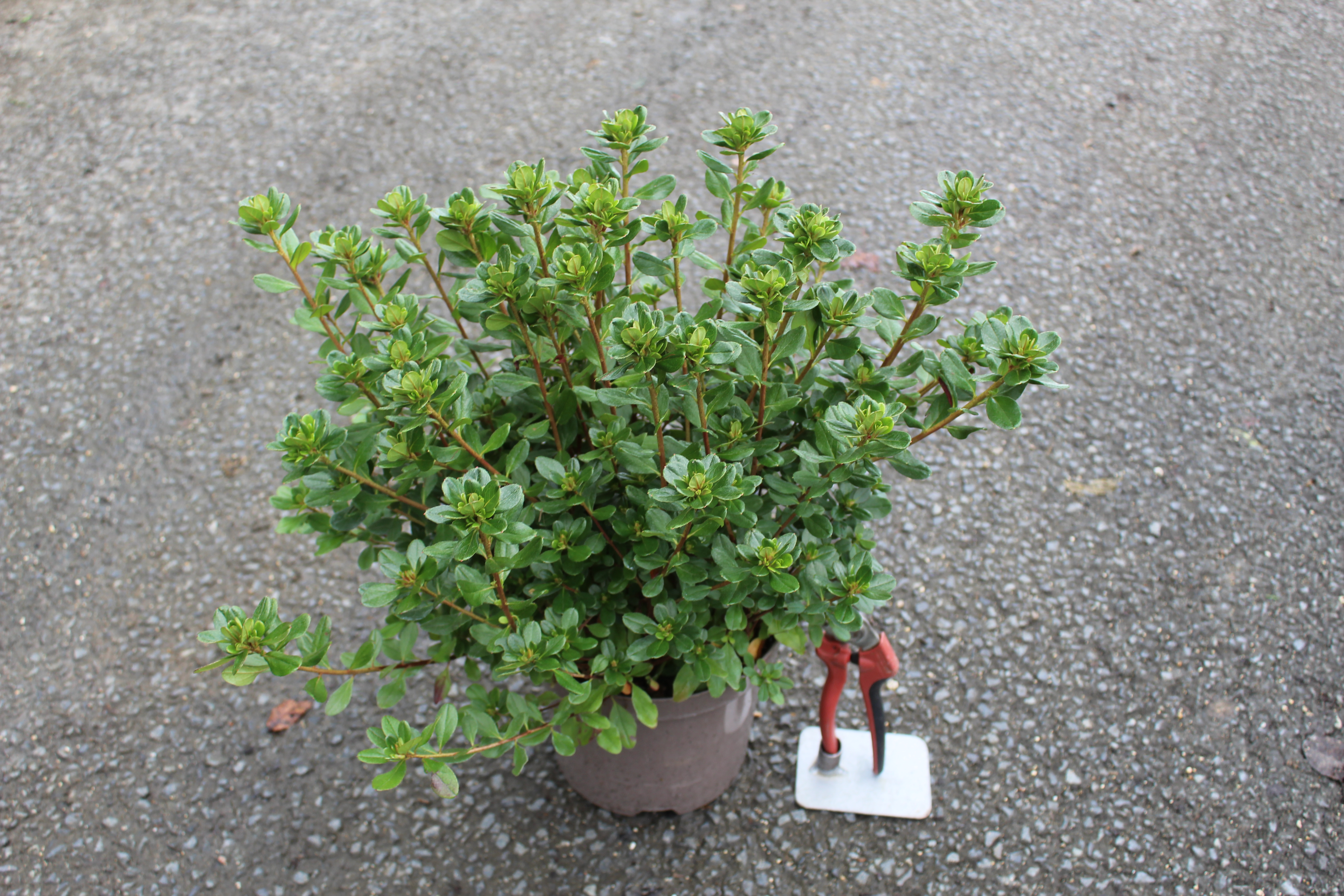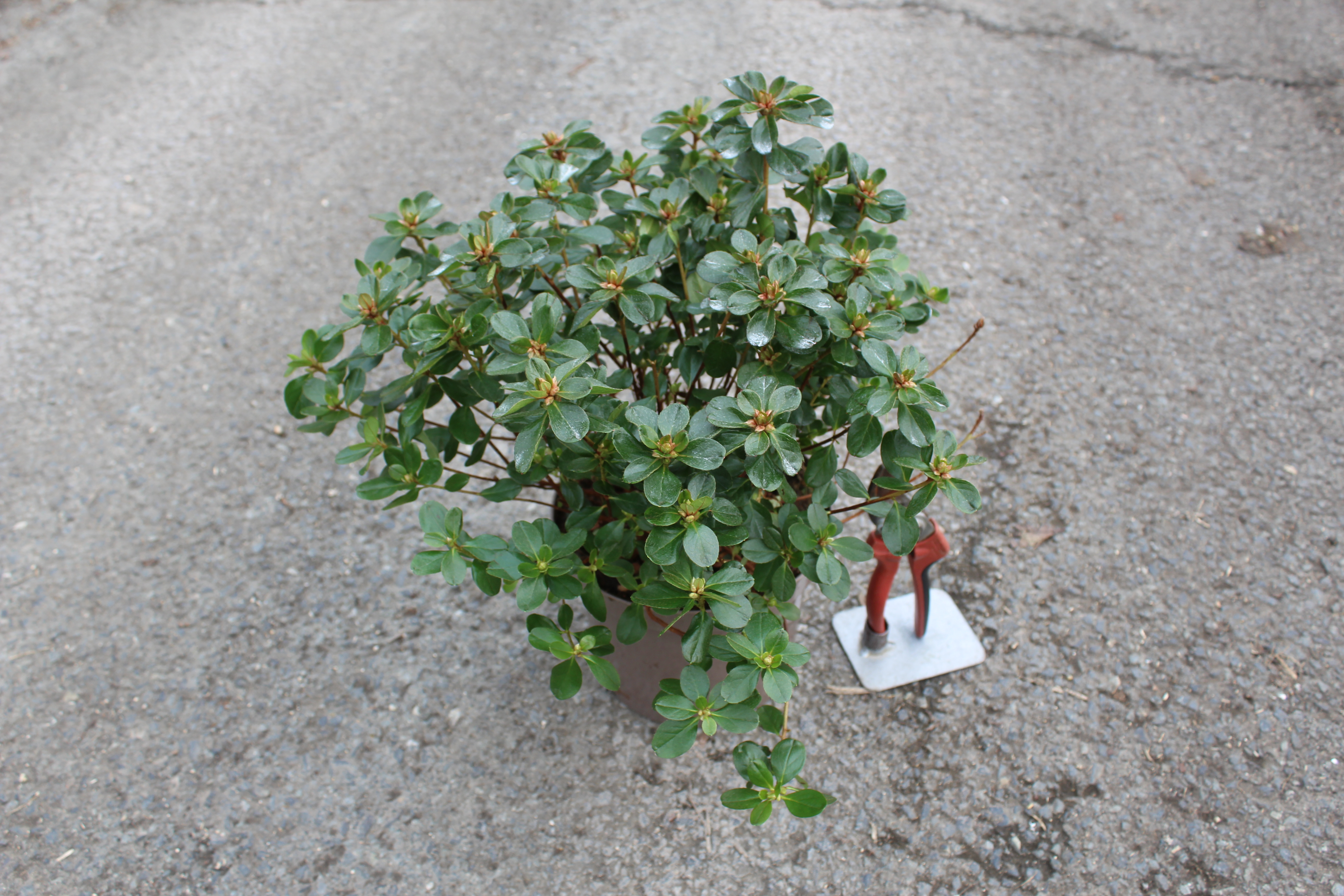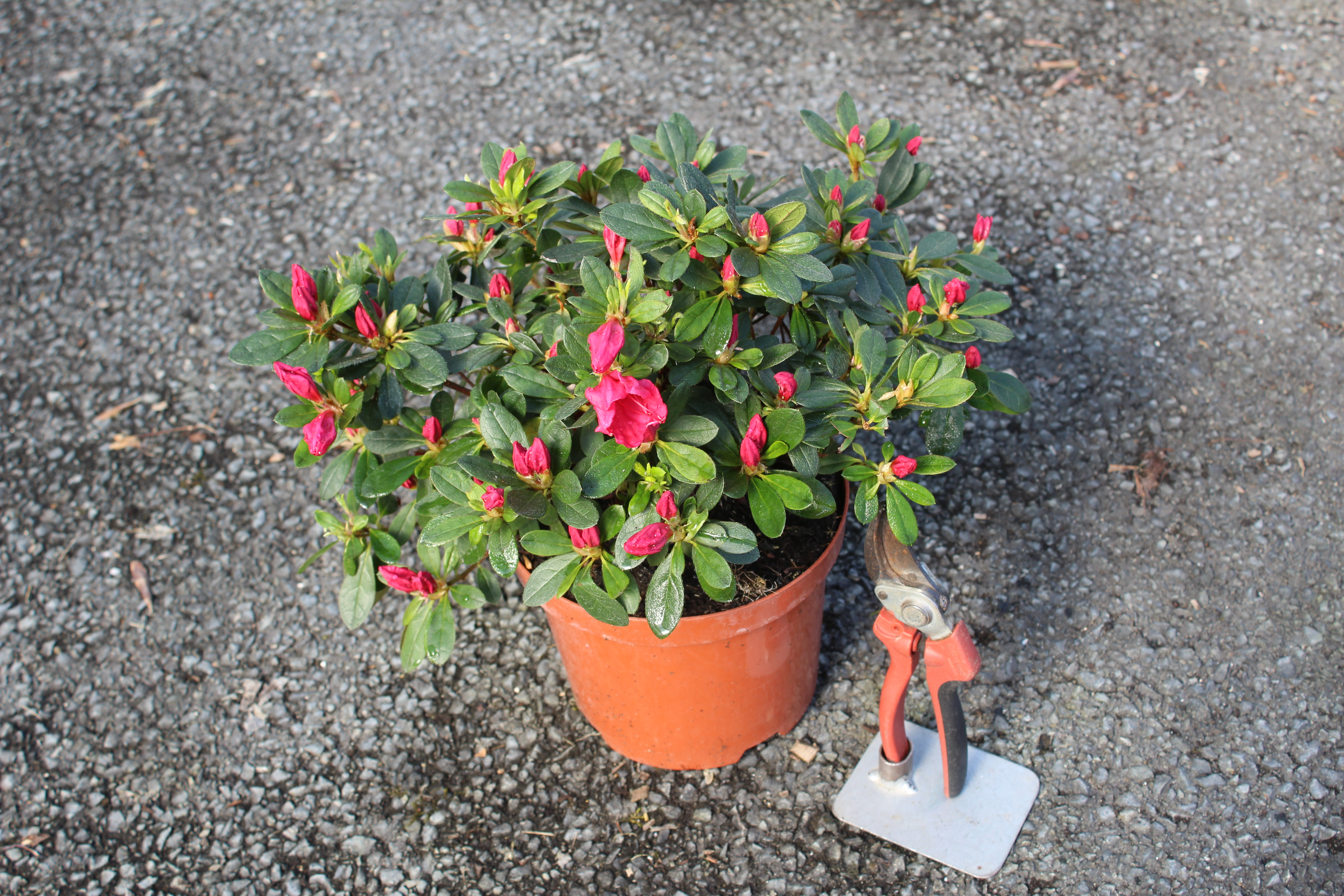 L'Azalée 'Hino Crimson' conserve naturellement son joli port compact, une véritable taille au sécateur est donc inutile. Contentez-vous d'un léger nettoyage juste après la floraison (fin mai) en pinçant délicatement les fleurs fanées. Ne taillez jamais en automne ou en hiver, sous peine de supprimer tous les boutons floraux du printemps suivant !