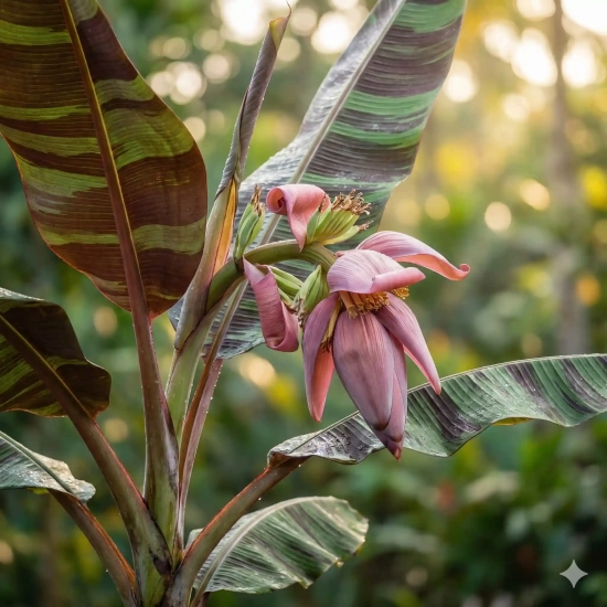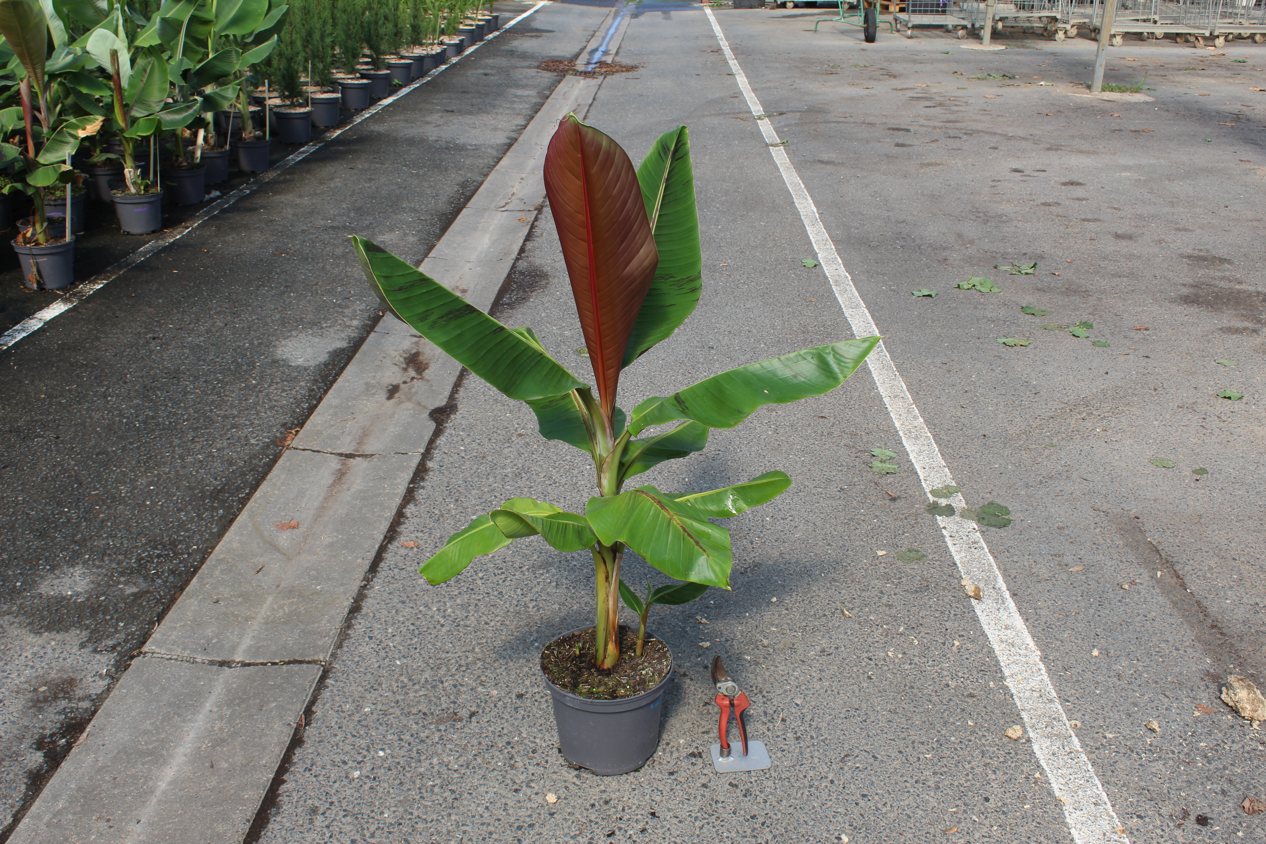 Il se distingue par son feuillage spectaculaire : ses grandes feuilles vertes sont zébrées de rayures pourpre foncé et rouge rubis (d'où son nom de "Tigre"), surtout lorsqu'il est jeune. Le revers de la feuille est souvent teinté de bordeaux. C'est la plante idéale pour apporter une touche de couleur et d'exotisme durable au jardin. Voir tous nos Bananiers (Musa).
