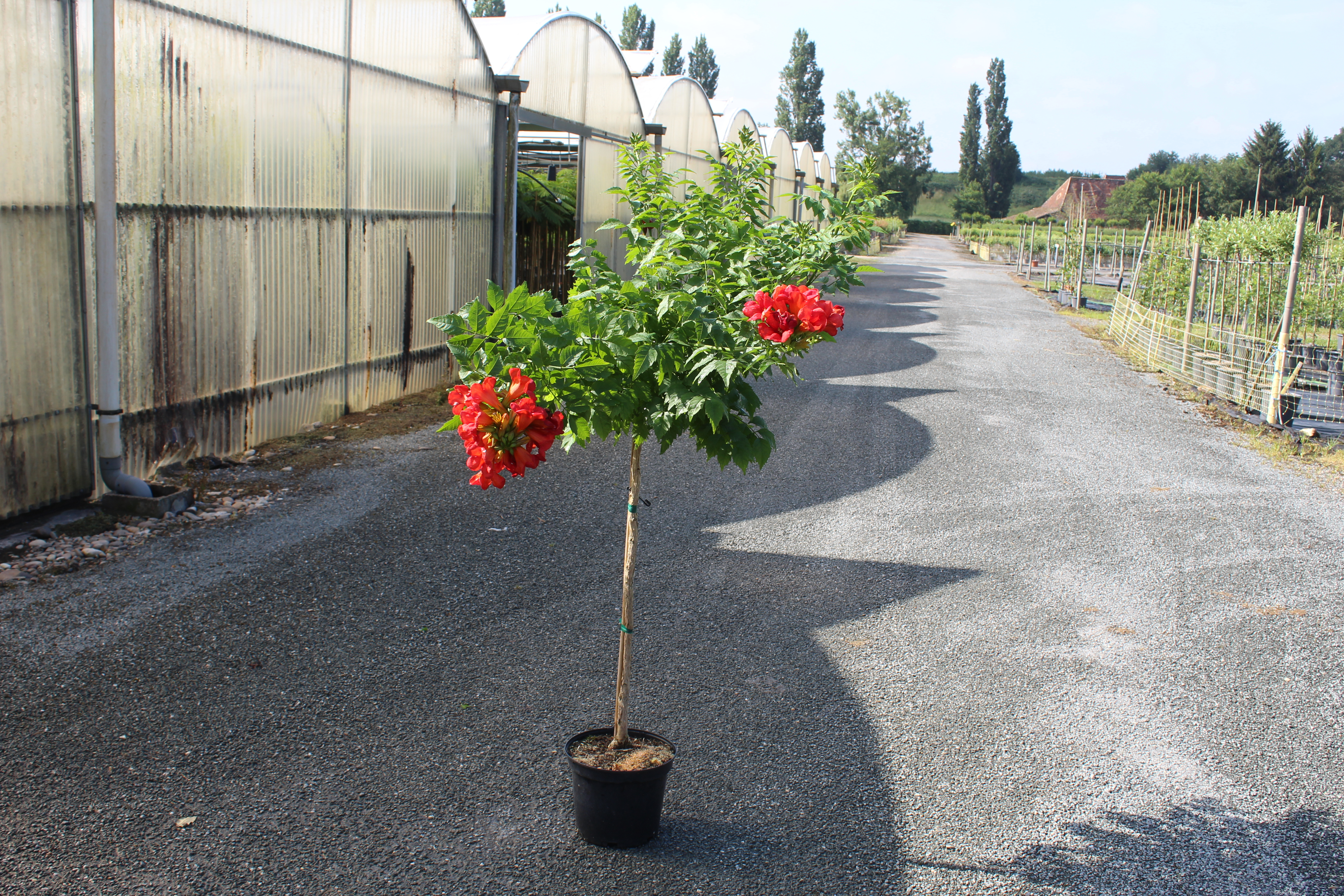 La culture de la Bignone 'Fire trumpet vine' est relativement simple, à condition de lui offrir les bonnes conditions. Cette plante préfère les sols bien drainés et riches en nutriments, mais peut s'adapter à des conditions moins idéales. Elle préfère les expositions ensoleillées ou légèrement ombragées, sachant que plus elle reçoit de lumière, plus elle produira de fleurs. Il est recommandé de l'arroser modérément pendant les périodes sèches, surtout lors de sa première année de croissance pour encourager un bon enracinement. Une fois établie, la Bignone 'Fire trumpet vine' est assez résistante à la sécheresse et nécessite peu d'entretien.