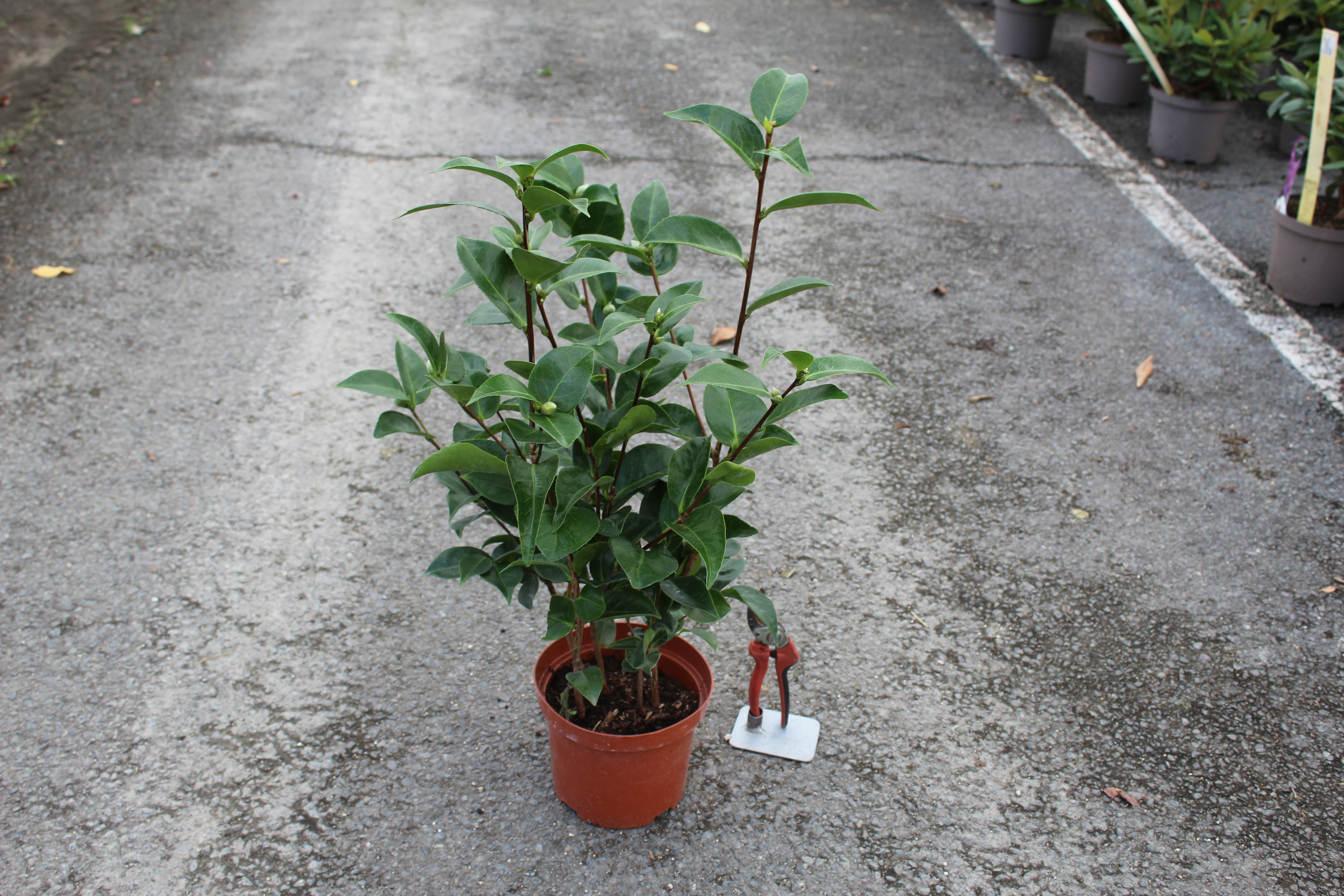 Le Camélia 'Charles Cobb' pousse à un rythme modéré et conserve naturellement une forme très harmonieuse. La taille n'est donc pas obligatoire. Si vous devez réduire son volume ou aérer le centre, intervenez exclusivement juste après la floraison (fin avril/mai). Ne taillez jamais en hiver ou au début du printemps, sous peine de supprimer toutes les fleurs de l'année !