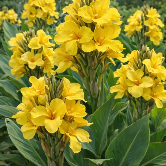 Ce qui rend le Canna 'Yellow' particulièrement attrayant, c’est sa capacité à s’adapter aux divers styles de jardinage, qu'ils soient formels ou informels. Son allure distincte peut se marier harmonieusement avec d'autres espèces de Cannas, ou même avec des plantes à fleurs de différentes teintes, offrant ainsi au jardinier une palette large pour s'exprimer.
