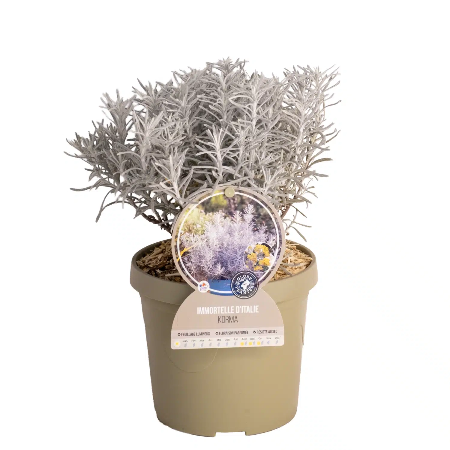Le Chrysocephalum 'Korma' est parfait pour orner des massifs ou des bordures, et peut également servir de couvre-sol. Sa capacité à résister aux terrains secs en fait un choix judicieux pour des jardins méditerranéens ou des aménagements paysagers en zone côtière. Idéal associé au Myosotis Des Marais Myosotis Palustris et au Lysimaque Commune Lysimachia Vulgaris pour composer un décor cohérent au fil des saisons. Évitez de le planter avec des espèces nécessitant un excès d'eau ou ayant des racines envahissantes. Adoptez le Chrysocephalum 'Korma' pour sa beauté et sa robustesse, et laissez-le égayer vos espaces extérieurs par son allure lumineuse et ses floraisons étalées.