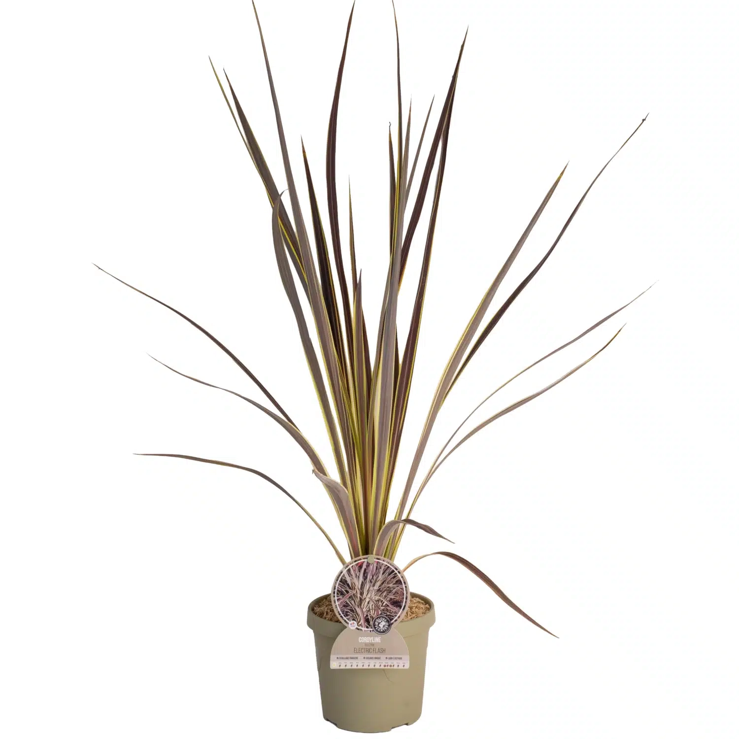 La Cordyline 'Electric Flash' (Cordyline australis) est une plante architecturale d'exception, plébiscitée pour son feuillage bicolore d'une grande finesse. Elle se distingue par ses longues feuilles rubanées d'un bronze chocolat profond, élégamment bordées de jaune crème et d'ivoire. Avec son port érigé qui finit par former un petit tronc avec l'âge, elle apporte une verticalité immédiate et une note exotique à vos jardins ou terrasses 365 jours par an.