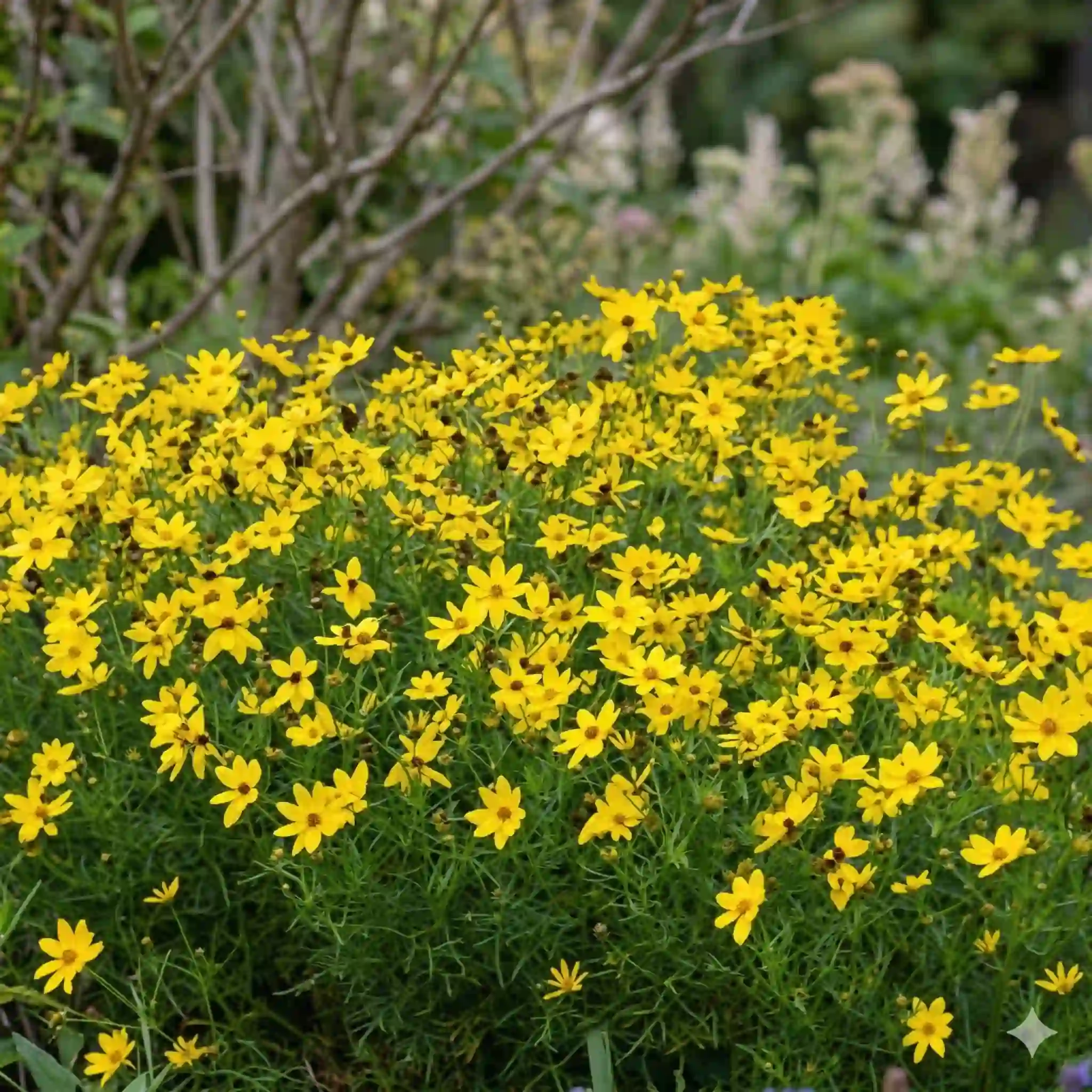 Le Coreopsis verticillata 'Zagreb' est une plante vivace d'une fiabilité exceptionnelle, prisée pour son port compact et son graphisme unique. Surnommé "Plume d'or", il se distingue par son feuillage vert sombre extrêmement fin, presque filiforme, qui forme un coussin dense et plumeux. De juin à septembre, il disparaît littéralement sous une profusion de petites fleurs étoilées d'un jaune d'or éclatant, apportant une luminosité incomparable aux jardins solaires.