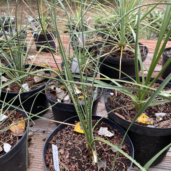 Son feuillage persistant est composé de feuilles longues, étroites et coriaces, de couleur vert à vert bleuté, disposées en rosette dense formant une boule très graphique. Avec l’âge, le Dasylirion leiophyllum peut développer un tronc court, très ornemental, qui renforce encore son allure sculpturale. C’est une vivace persistante typique des plantes xérophiles (plantes de désert), parfaitement adaptée aux sols maigres et aux climats secs.