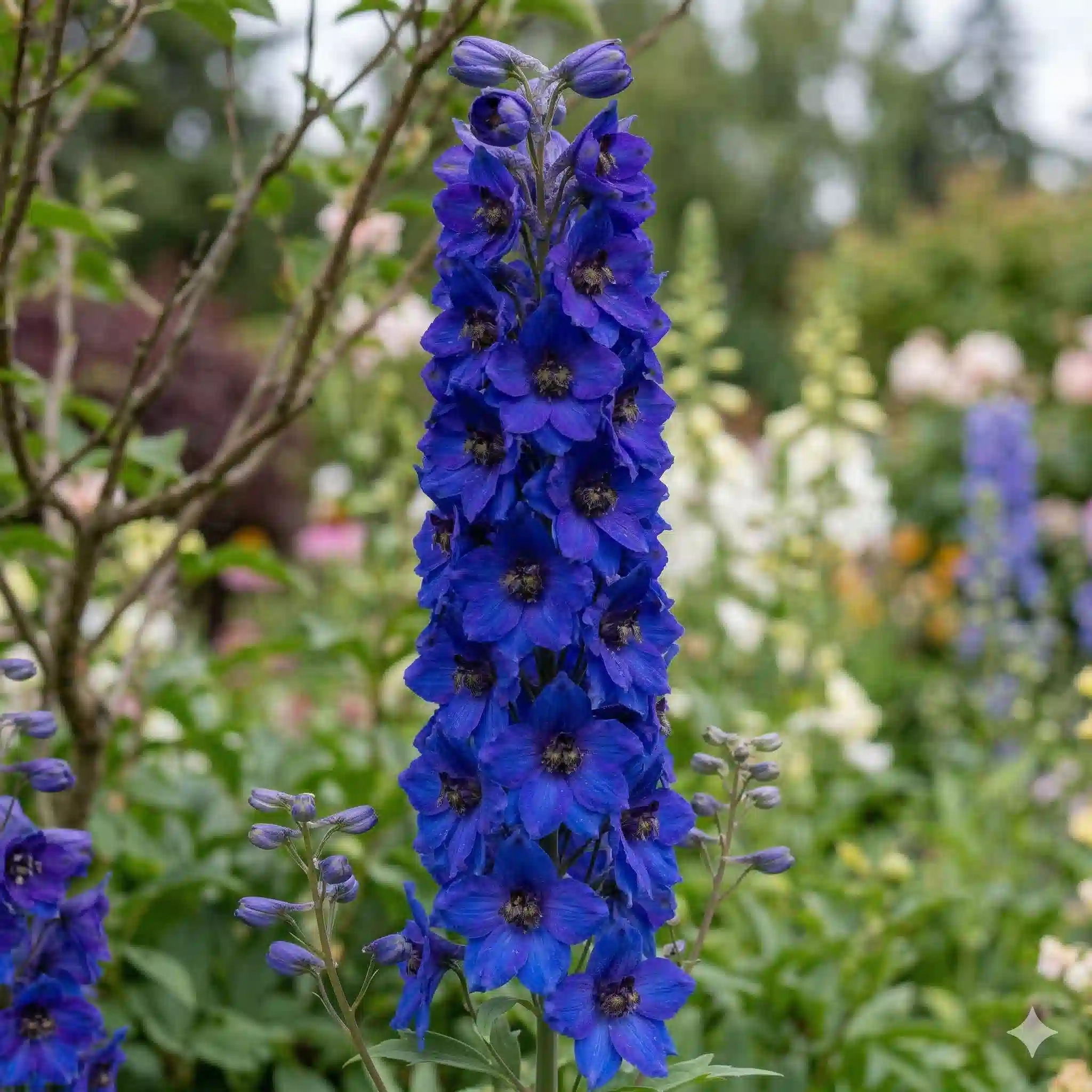 Le Delphinium 'Dark Blue', ou Dauphinelle, est la plante vivace par excellence pour apporter de la verticalité et une intensité chromatique rare. Ses épis floraux monumentaux se parent d'un bleu indigo profond, presque électrique, qui captive le regard de juin à juillet. Son feuillage découpé, d'un vert forêt élégant, forme une base dense d'où s'élancent ces colonnes florales aristocratiques, transformant chaque massif en un tableau de maître.