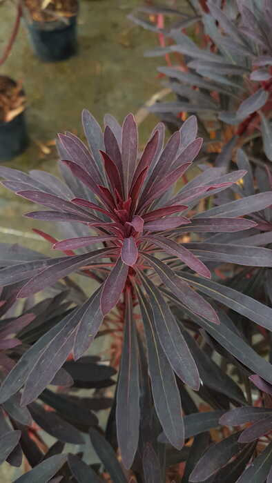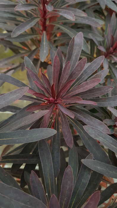 L'Euphorbe 'Miner's Merlot' (Euphorbia amygdaloides 'Miner's Merlot') est une plante vivace d'une rare intensité dramatique au jardin. Elle se distingue par un feuillage persistant aux teintes profondes et changeantes : d'un vert olive sombre aux reflets pourpres en été, il vire à un spectaculaire rouge bordeaux à lie-de-vin (rappelant la robe du célèbre cépage Merlot) sous l'effet du froid hivernal.
