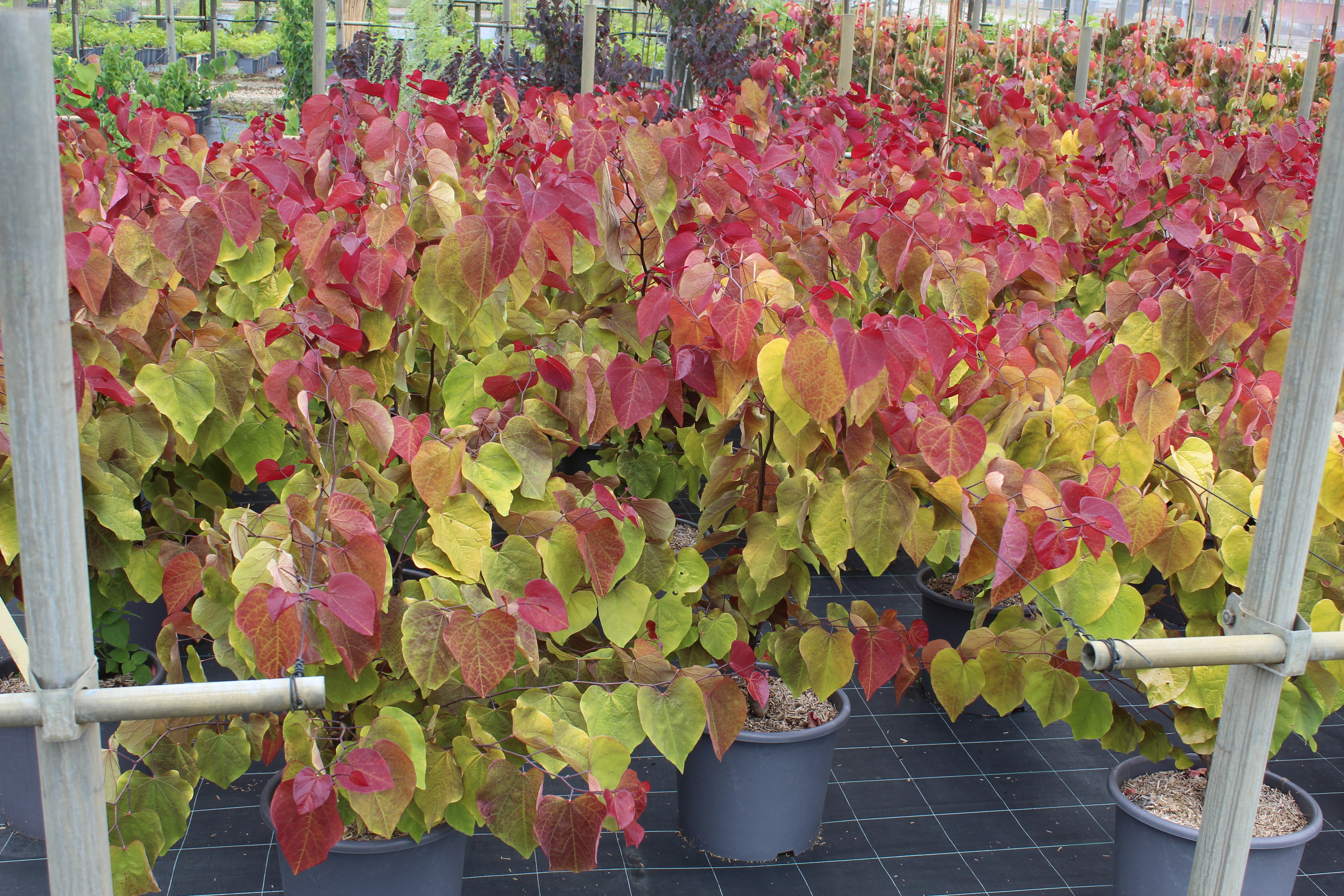 Le Cercis canadensis 'Eternal Flame' est un gainier du Canada compact et très décoratif, apprécié pour son feuillage changeant rouge, orange, vert puis jaune en automne. Il atteint 3 à 4 m de hauteur et 2 à 3 m de largeur et offre une floraison rose vif en avril-mai avant les feuilles. Rustique jusqu’à -20 °C, il s’adapte aux sols fertiles et drainés, en plein soleil ou à mi-ombre.