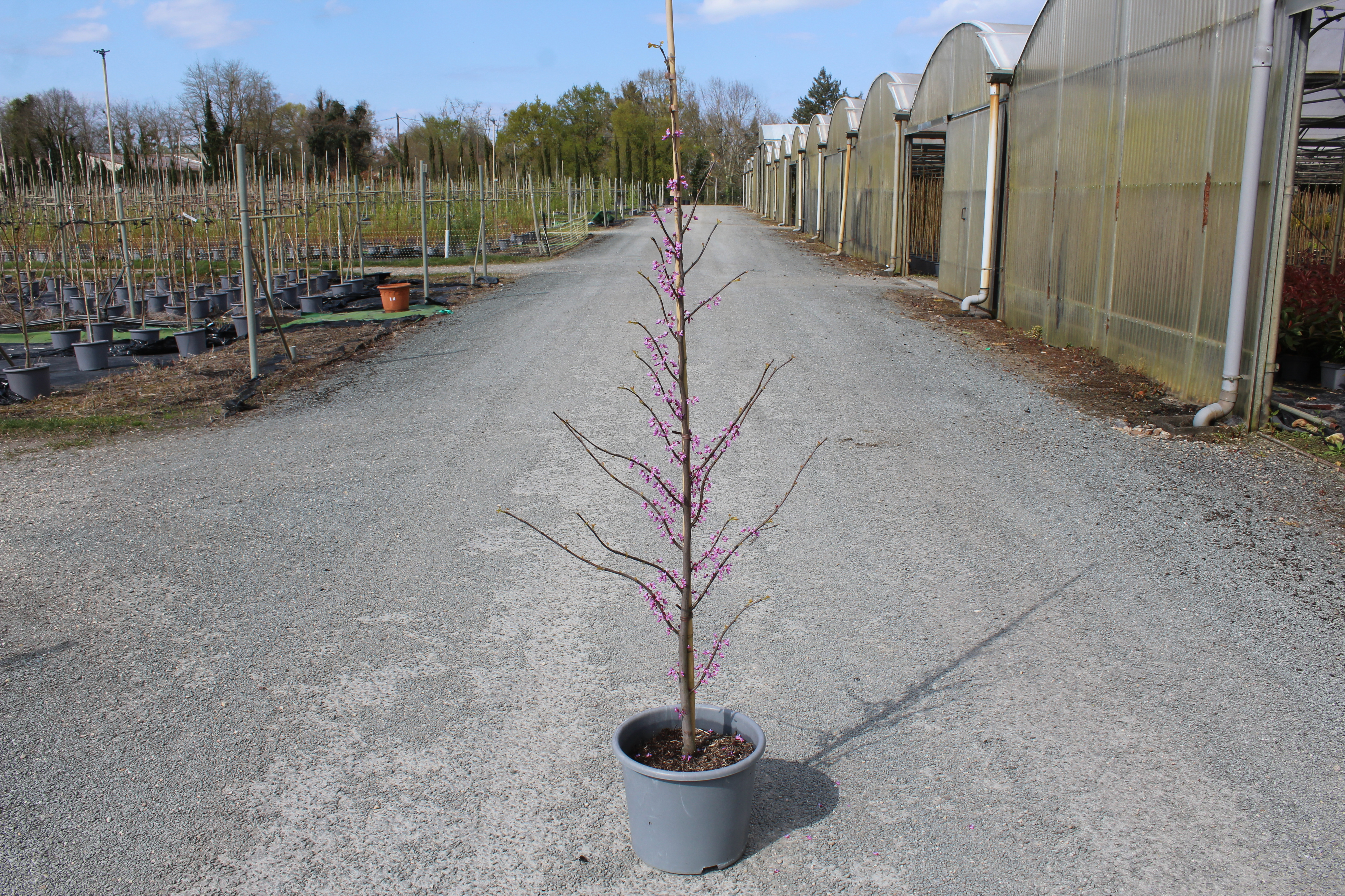 Ce cultivar se distingue par ses **feuilles en forme de cœur d’un jaune doré éclatant**, qui apparaissent après une floraison spectaculaire en avril-mai. À maturité, il atteint **3 à 4 m de hauteur pour 2 à 3 m de largeur**, avec un port naturellement arrondi et harmonieux, idéal pour les espaces réduits.