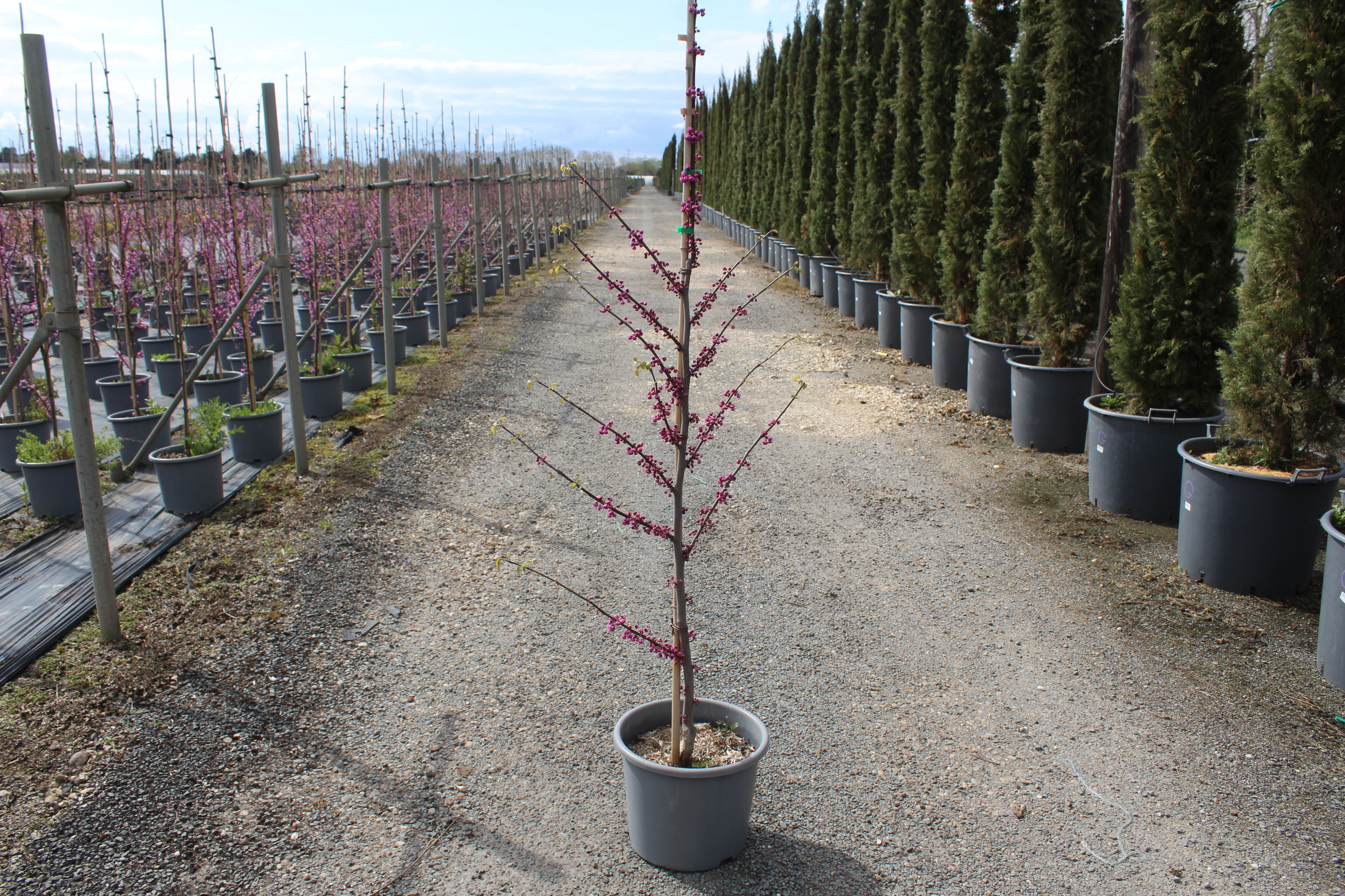 Ce cultivar se distingue par sa **floraison rose vif en grappes doubles**, plus dense que celle des autres gainiers. À maturité, il atteint **3 à 4 m de hauteur et 2,5 à 3,5 m de largeur**, avec un port arrondi et régulier. Ses **feuilles en forme de cœur**, vert tendre au printemps, deviennent plus foncées en été puis jaunes à l’automne, offrant un intérêt ornemental tout au long de l’année.
