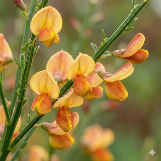 Le Genêt 'Lena' est sans doute la variété la plus flamboyante de la gamme. Oubliez le jaune uni : ses fleurs offrent un spectacle vibrant, mélangeant le rouge rubis, l'orange abricot et le jaune d'or. De loin, l'arbuste semble embrasé, créant un effet visuel chaud et dynamique.