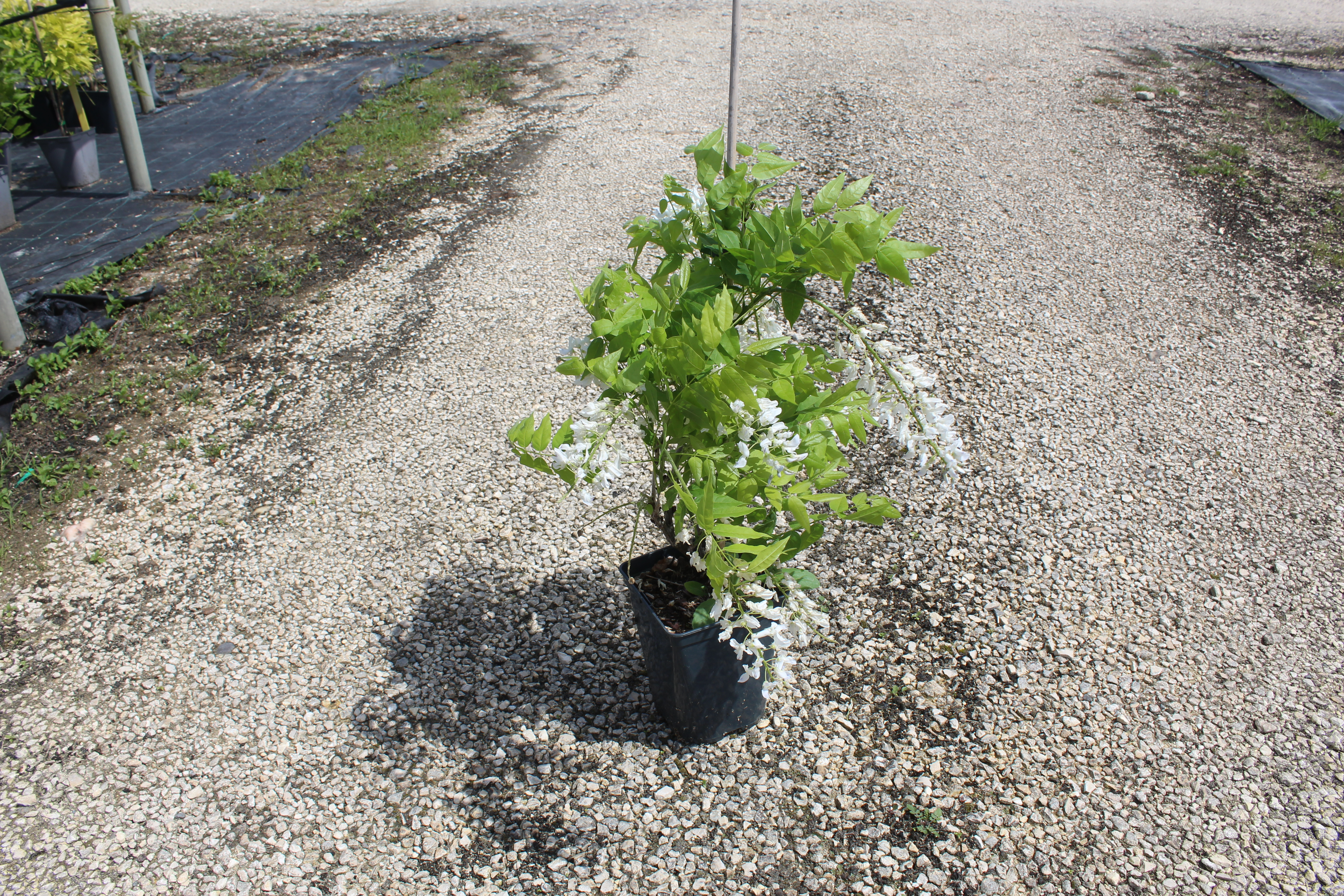 La Glycine de chine 'Alba' se distingue par ses tiges grimpantes qui peuvent atteindre plusieurs mètres de long. Sa capacité à s’accrocher à des supports tels que des treillis, pergolas ou clôtures en fait un excellent choix pour couvrir les espaces vides du jardin. Les feuilles de cette glycine sont composées de segments ovales et légèrement dentelés, offrant un feuillage dense et attrayant qui ajoute une dimension supplémentaire à son allure. Le contraste entre le feuillage vert foncé et les fleurs éclatantes crée un effet visuel captivant. La plante est résistante et peut s’adapter à différents types de sols, bien qu’elle préfère les terrains riches, bien drainés et ensoleillés pour une croissance optimale.