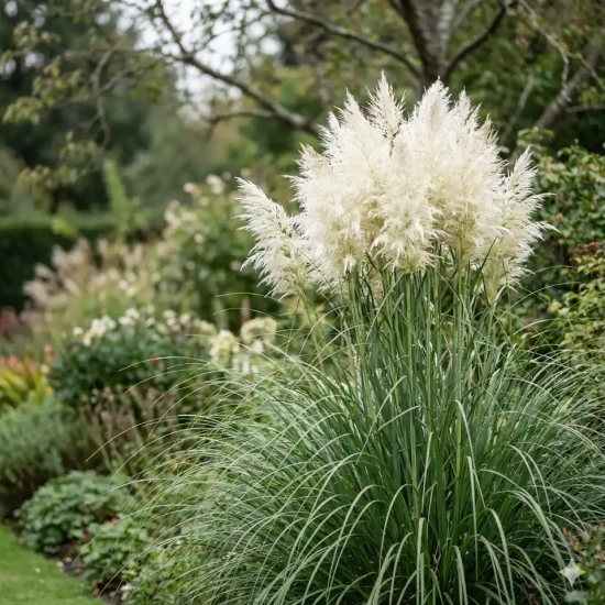 L'Herbe de la pampa 'Blanc' (Cortaderia selloana 'Blanc') est l'une des graminées ornementales les plus spectaculaires et majestueuses de nos jardins. Formant une touffe géante au feuillage persistant, elle s'élance à plus de 2,5 mètres de haut en fin d'été (de septembre à novembre) pour déployer d'immenses inflorescences plumeuses d'un blanc argenté et soyeux. Ces grands plumeaux accrochent magnifiquement la lumière rase de l'automne et restent décoratifs tout au long de l'hiver.