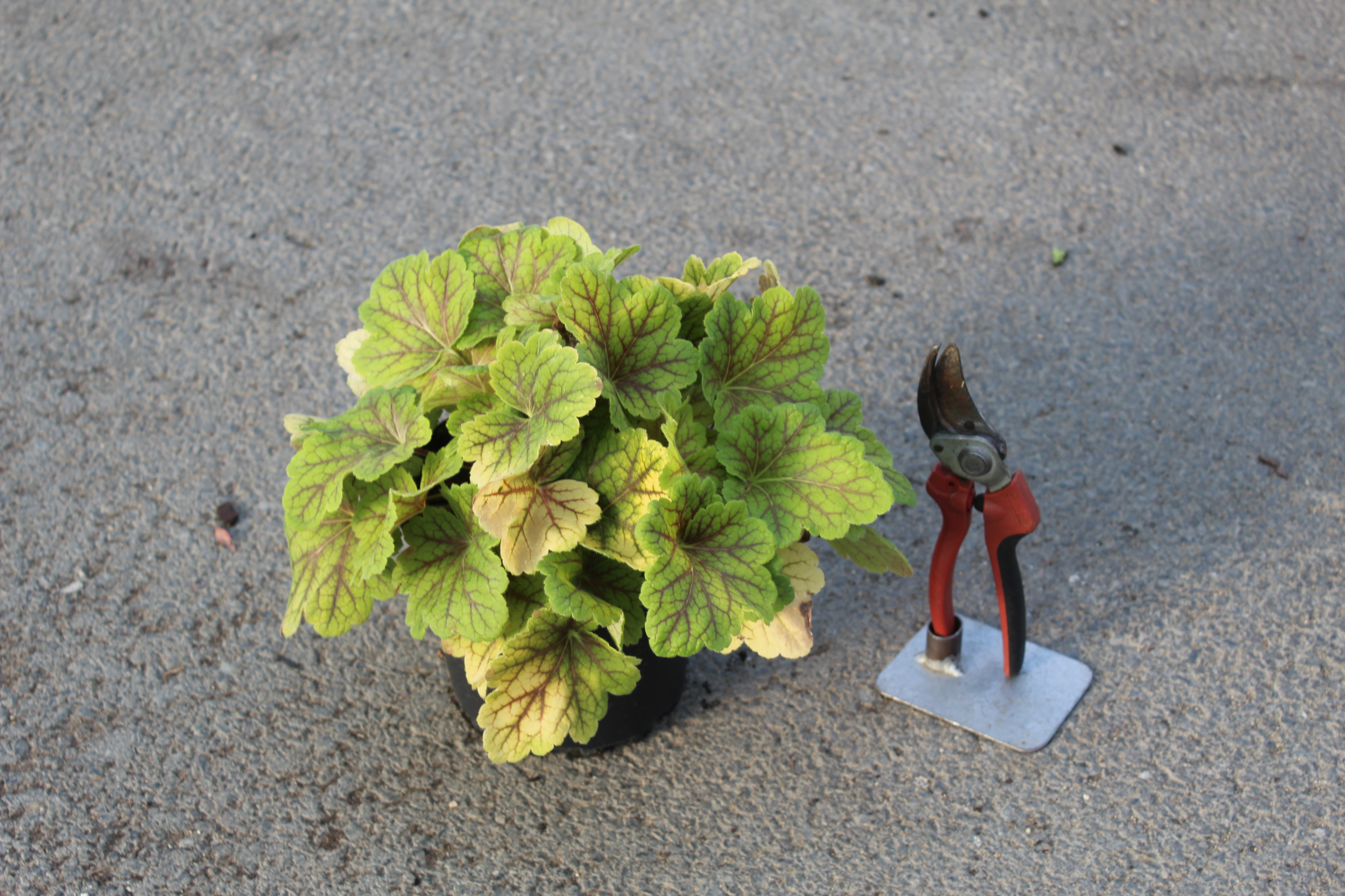 L’Heuchera ‘Electra’ est une variété aux feuilles d’un jaune vif à chartreuse lumineux, parcouru par des nervures rouge vif très prononcées qui créent un effet graphique saisissant, comme des fils électriques sur fond doré. Cette combinaison de couleurs unique en fait l’une des heuchers les plus spectaculaires et les plus reconnaissables du marché horticole.
