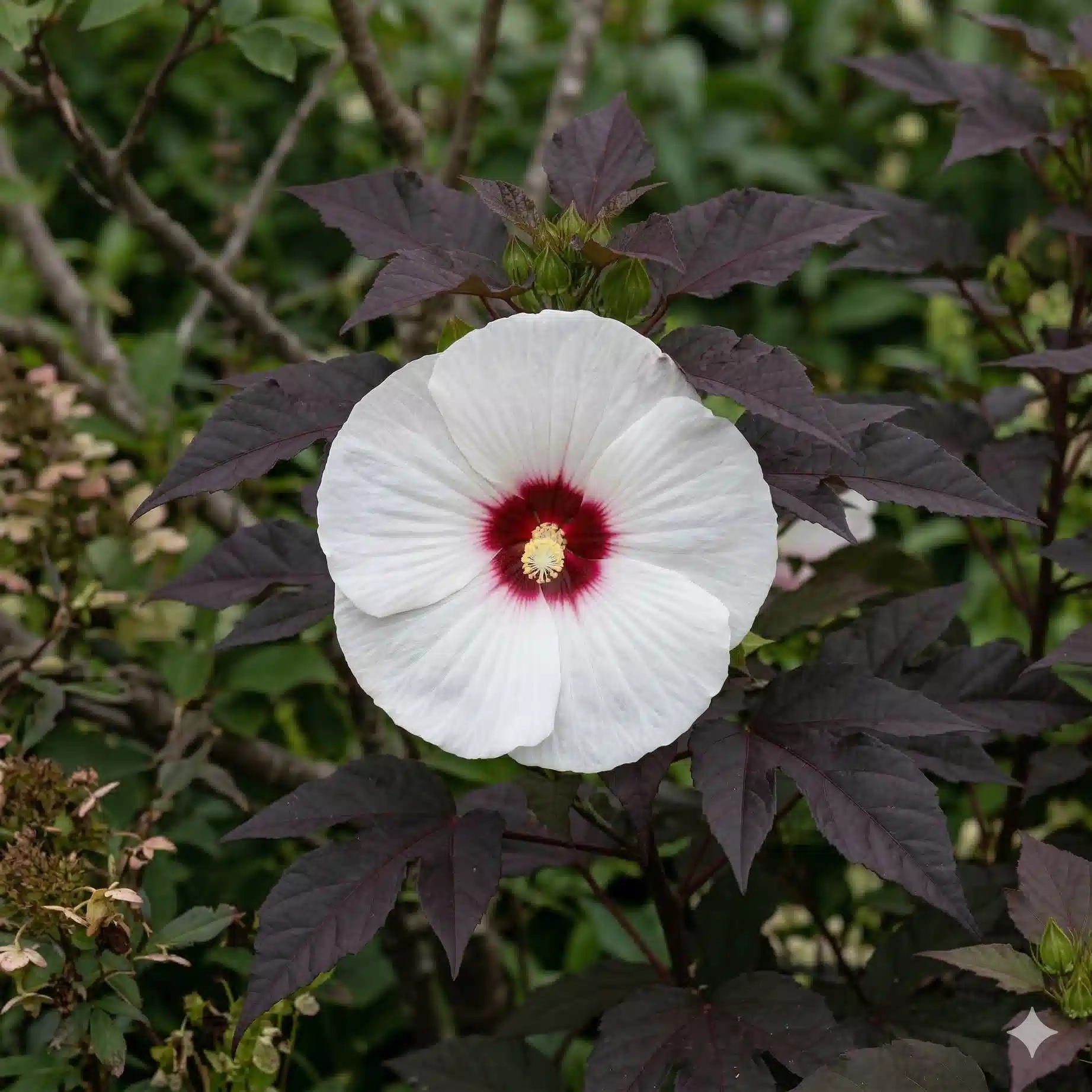 L'Hibiscus moscheutos 'Dark Mystery' est une plante vivace monumentale qui redéfinit l'élégance au jardin. Il se distingue par son feuillage exceptionnel, profondément découpé et d'un pourpre-noir intense, presque métallique. De juillet à septembre, ce fond sombre sublime l'éclosion de fleurs gigantesques d'un blanc pur à rose très pâle, marquées d'un large œil central rouge rubis. Ce contraste entre le feuillage ébène et la clarté des fleurs crée un effet visuel saisissant, digne des plus beaux jardins tropicaux.