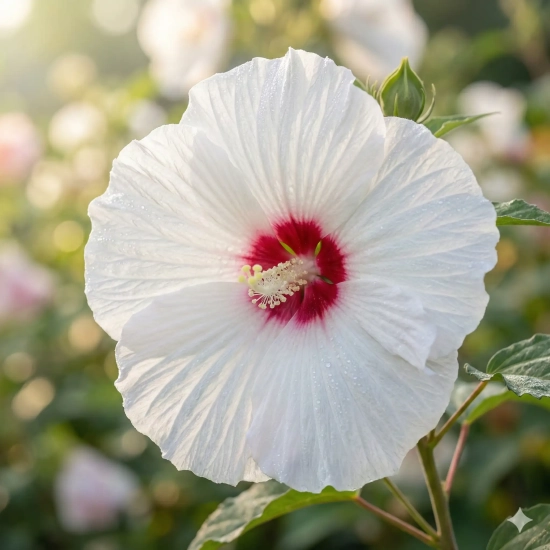 L'Hibiscus des marais 'Fungi blanc rosé' (*Hibiscus moscheutos*) se distingue par ses grandes fleurs blanches rosées à cœur rouge, apportant une touche d'exotisme et de couleur au jardin. Avec une floraison éblouissante de juillet à septembre, cette plante vivace spectaculaire s'élève à une hauteur impressionnante de 1,2 m à 1,5 m. Originaire d'Amérique du Nord, elle ne manquera pas d'attirer les regards dans n'importe quel massif fleuri. Voir tous nos Hibiscus Des Marais Hibiscus Moscheuto