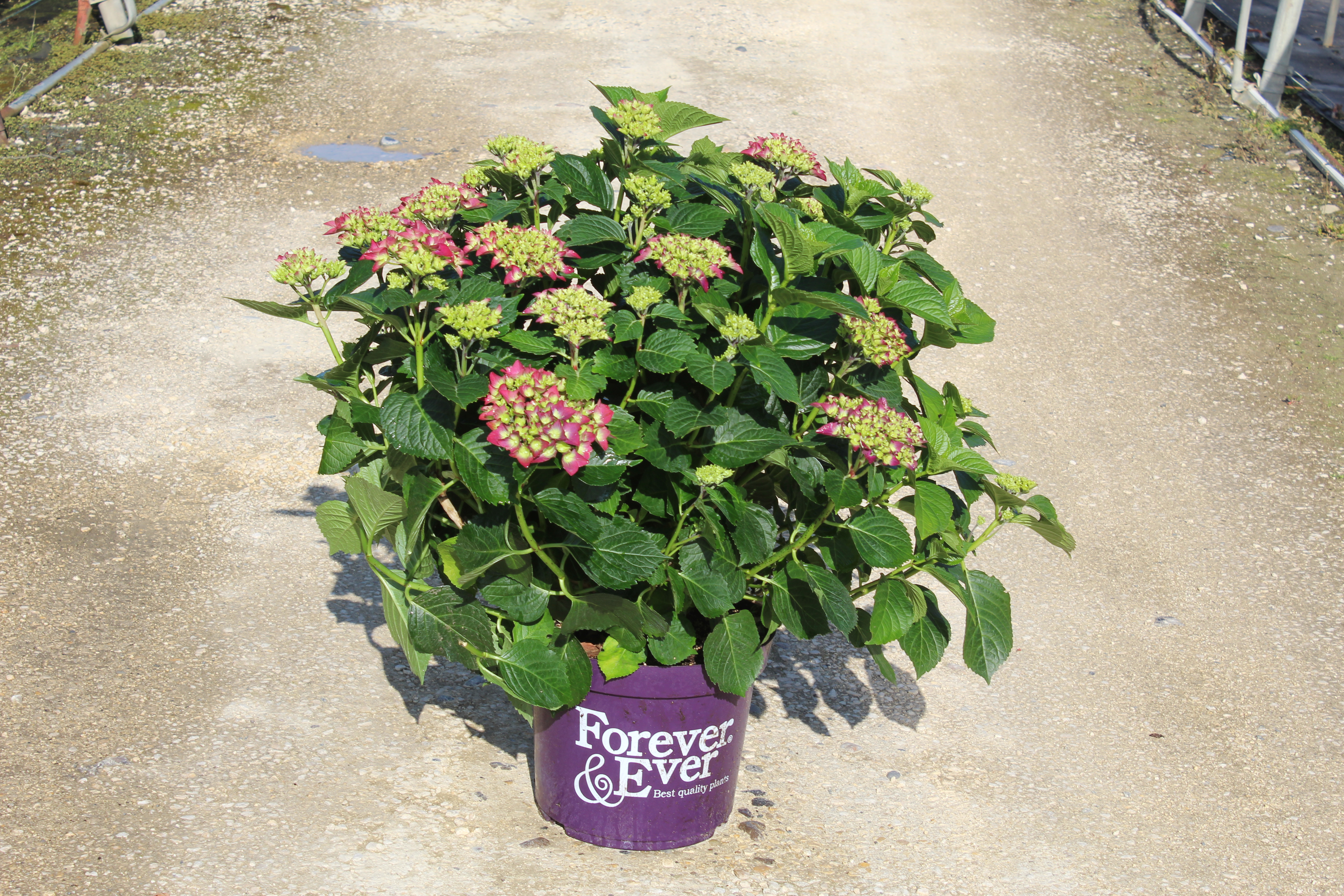 L'Hortensia 'Forever and ever rouge' est un arbuste à feuilles caduques qui peut atteindre une hauteur de 1 à 1,2 mètre. Sa largeur peut aller jusqu'à 1,5 mètre, ce qui en fait une plante idéale pour les massifs, les bordures ou même en pot sur un balcon. Les feuilles, de forme elliptique et d'un vert intense, créent un contraste saisissant avec les fleurs. Ces dernières apparaissent tout au long de la saison, généralement de mai jusqu'à octobre, garantissant ainsi un spectacle floral continu.
