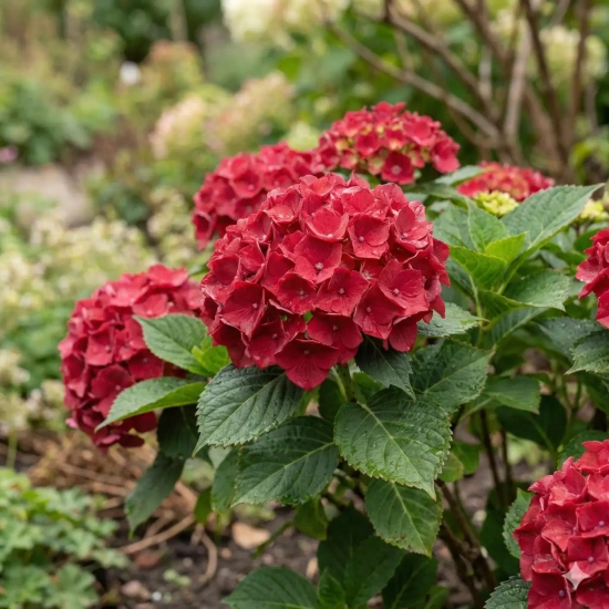 L'Hortensia 'Leuchtfeuer' (Hydrangea macrophylla 'Leuchtfeuer', dont le nom allemand signifie "Phare" ou "Feu de signalisation") porte merveilleusement son nom. De juin à septembre, cet arbuste d'ornement spectaculaire enflamme littéralement les zones ombragées de votre jardin. Il déploie de somptueuses inflorescences globuleuses d'un rouge vif et intense, créant un contraste saisissant et très chaleureux avec son généreux feuillage vert profond.