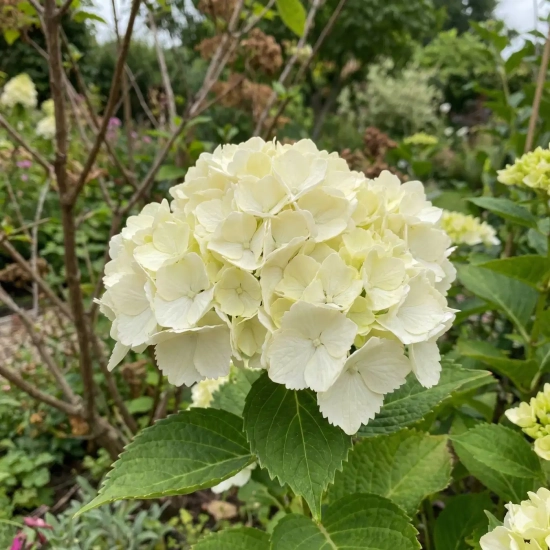 L'Hortensia 'Mme Mouillère' (Hydrangea macrophylla 'Madame Emile Mouillère') est une véritable légende des jardins. Créée en France au début du XXe siècle, cette variété historique est souvent considérée comme l'un des meilleurs hortensias blancs jamais obtenus. De juillet à octobre, il déploie de somptueuses inflorescences globuleuses d'un blanc pur et lumineux, dont les pétales délicatement dentelés peuvent se parer de discrets reflets rosés en fin de saison.