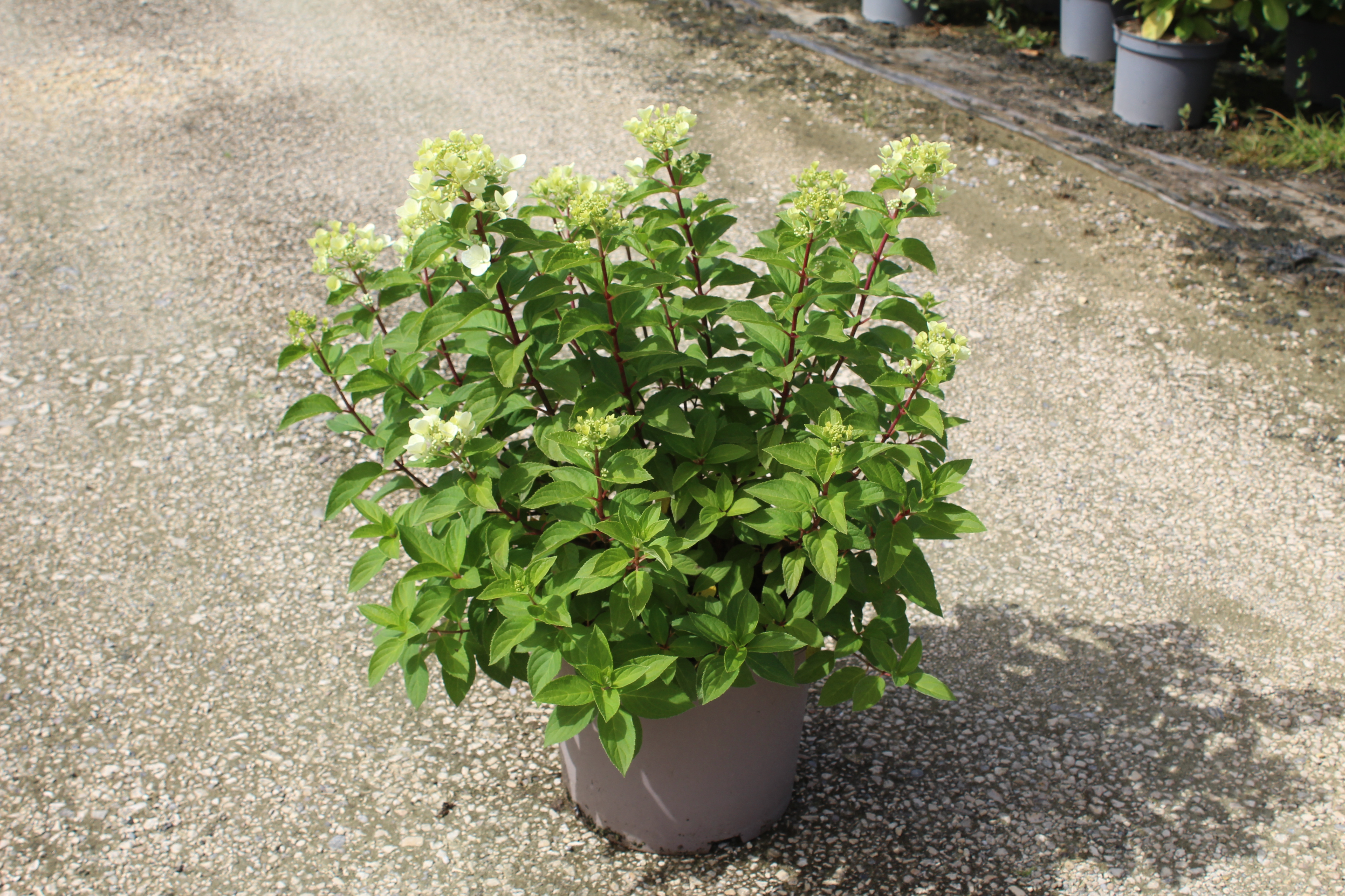 Pour cultiver l'Hortensia paniculé 'Diamant rouge' dans les meilleures conditions, il est essentiel de lui offrir un emplacement adapté. Cette plante préfère les endroits semi-ombregés, bien qu'elle puisse également prospérer sous un ensoleillement direct, surtout le matin. Un sol légèrement acide à neutre est idéal pour sa croissance. Il est conseillé d'amender le sol avec du compost ou de la tourbe pour améliorer la rétention d'eau et la fertilité.L'arrosage est un facteur crucial dans l'entretien de l'Hortensia paniculé 'Diamant rouge'. Pendant les périodes sèches, il est important de maintenir le sol humide mais pas détrempé. Un arrosage régulier favorise une floraison abondante et contribue à la santé générale de la plante. En hiver, la réduction des arrosages est recommandée, car une trop grande humidité peut entraîner des problèmes de pourriture des racines.La taille est également une étape importante pour le bon développement de l'Hortensia paniculé 'Diamant rouge'. Il est préférable de procéder à une taille légère chaque année, soit à la fin de l'hiver ou au début du printemps, pour favoriser la régénération de la plante et le développement de nouvelles fleurs. Cette taille permet également de retirer les branches mortes ou abîmées et d'aérer le centre de l'arbuste pour une circulation d'air optimale.
