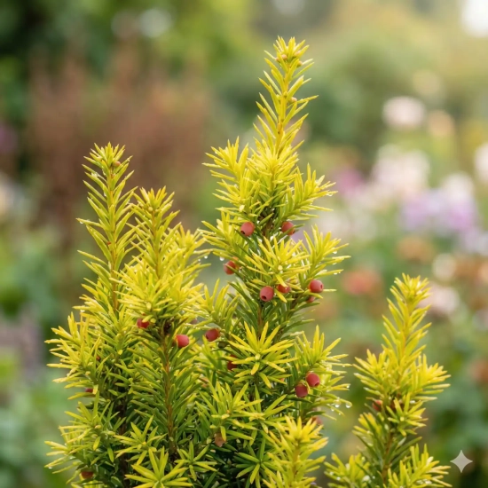Le Taxus baccata 'Fastigiata Aurea' est la version lumineuse du célèbre If d'Irlande. Il se distingue par son port naturellement colonnaire et très étroit (comme un cierge), idéal pour donner de la verticalité et de la structure à un jardin sans prendre de place au sol.