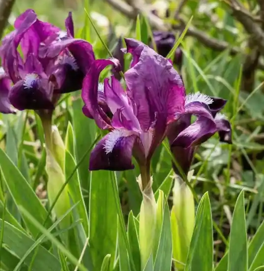 L'Iris pumila 'Jenny Grace' est une petite merveille printanière, particulièrement appréciée pour sa floraison précoce et son format compact. Dès le mois de mars, il dévoile des fleurs aux teintes pastel délicates, souvent nuancées de mauve et de blanc, qui dégagent un parfum subtil. Son feuillage en forme de glaive, vert vif et rigide, forme des touffes denses qui restent décoratives bien après la floraison, structurant idéalement les devants de massifs.