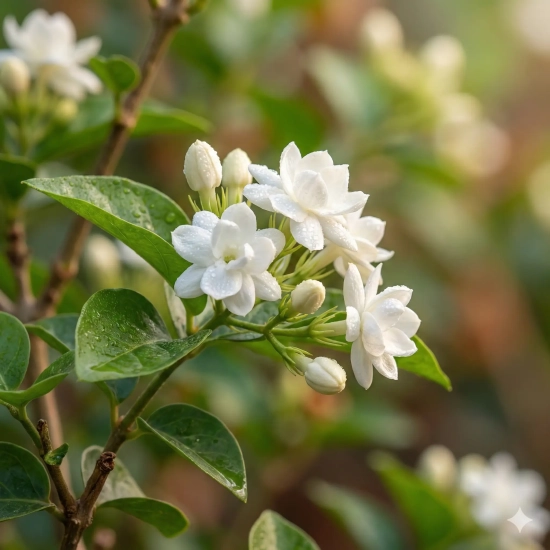 Le Jasmin d'Arabie (Jasminum sambac) est la fine fleur des parfumeurs. Si vous cherchez l'odeur mythique du **thé au jasmin** ou du **Monoï**, c'est lui. Ses fleurs, d'un blanc pur et cireux (plus épaisses que celles du jasmin classique), exhalent un parfum puissant, fruité et sucré, qui embaume une pièce entière le soir venu.