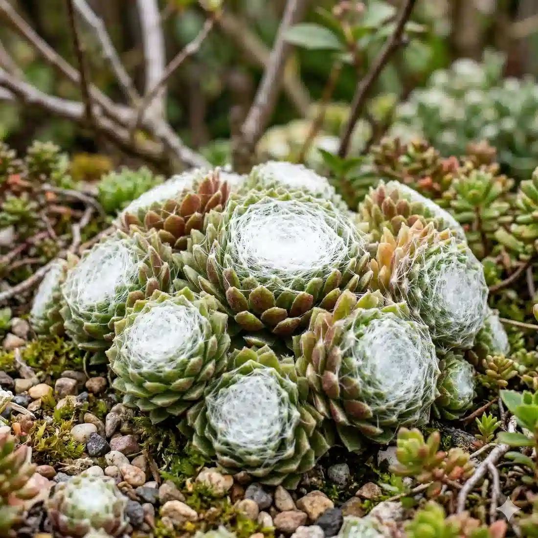 En fin d'hiver : Avec une pince à épiler ou vos doigts, retirez délicatement les petites feuilles desséchées à la base des rosettes pour éviter qu'elles ne retiennent l'humidité. Après la floraison : La rosette centrale meurt après avoir fleuri. Retirez la hampe sèche et la rosette morte ; le trou sera vite comblé par la nouvelle génération.