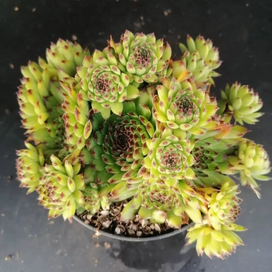 Une fois établie, la Joubarbe se passe totalement d'eau en pleine terre. En pot, laissez toujours le substrat sécher totalement entre deux apports. La fertilisation est superflue : un sol trop riche ferait "gonfler" les rosettes, leur faisant perdre leur port compact et leurs couleurs vives. Un surfaçage de gravier ou un peu de compost tous les 3 ans suffit.