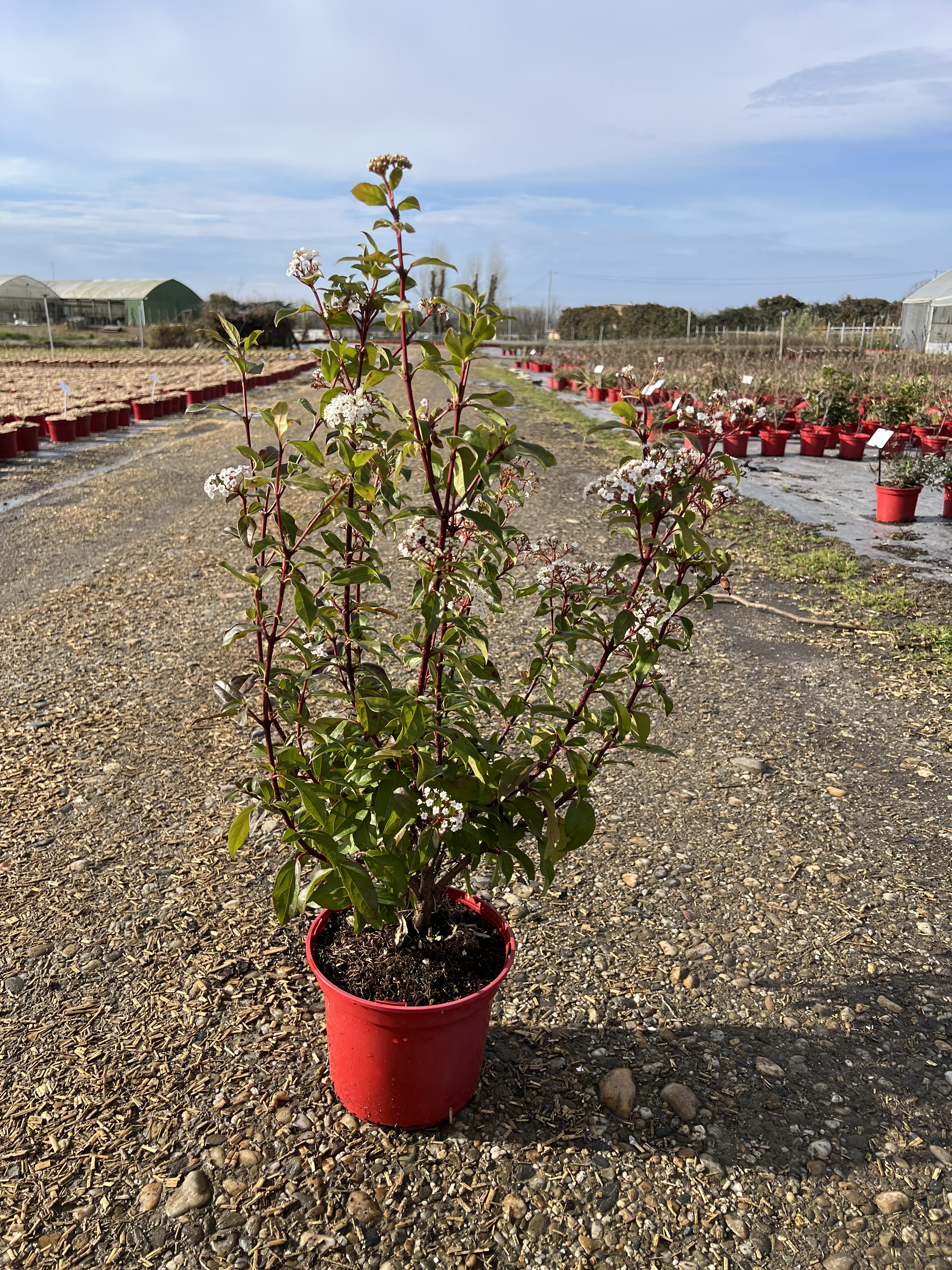 Le Laurier-tin 'Quimper' (Viburnum tinus) est le sauveur des jardins tristes en hiver. Alors que la plupart des plantes sont en dormance, lui se réveille ! Dès le mois de novembre et jusqu'en avril, il se couvre de boutons rose foncé qui s'ouvrent en petites fleurs blanches, formant un contraste magnifique avec son feuillage vert sombre.