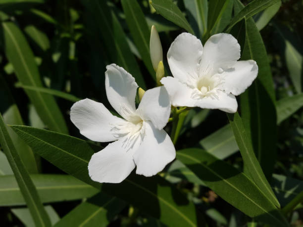 Le Laurier-rose 'Petite White' (Nerium oleander 'Petite White') est une variété naine exceptionnelle, spécialement sélectionnée pour les petits espaces et la culture en bac. De juin à septembre, ce petit arbuste buissonnant se couvre d'une multitude de fleurs simples d'un blanc immaculé, créant un contraste saisissant et très élégant avec son feuillage persistant vert sombre.