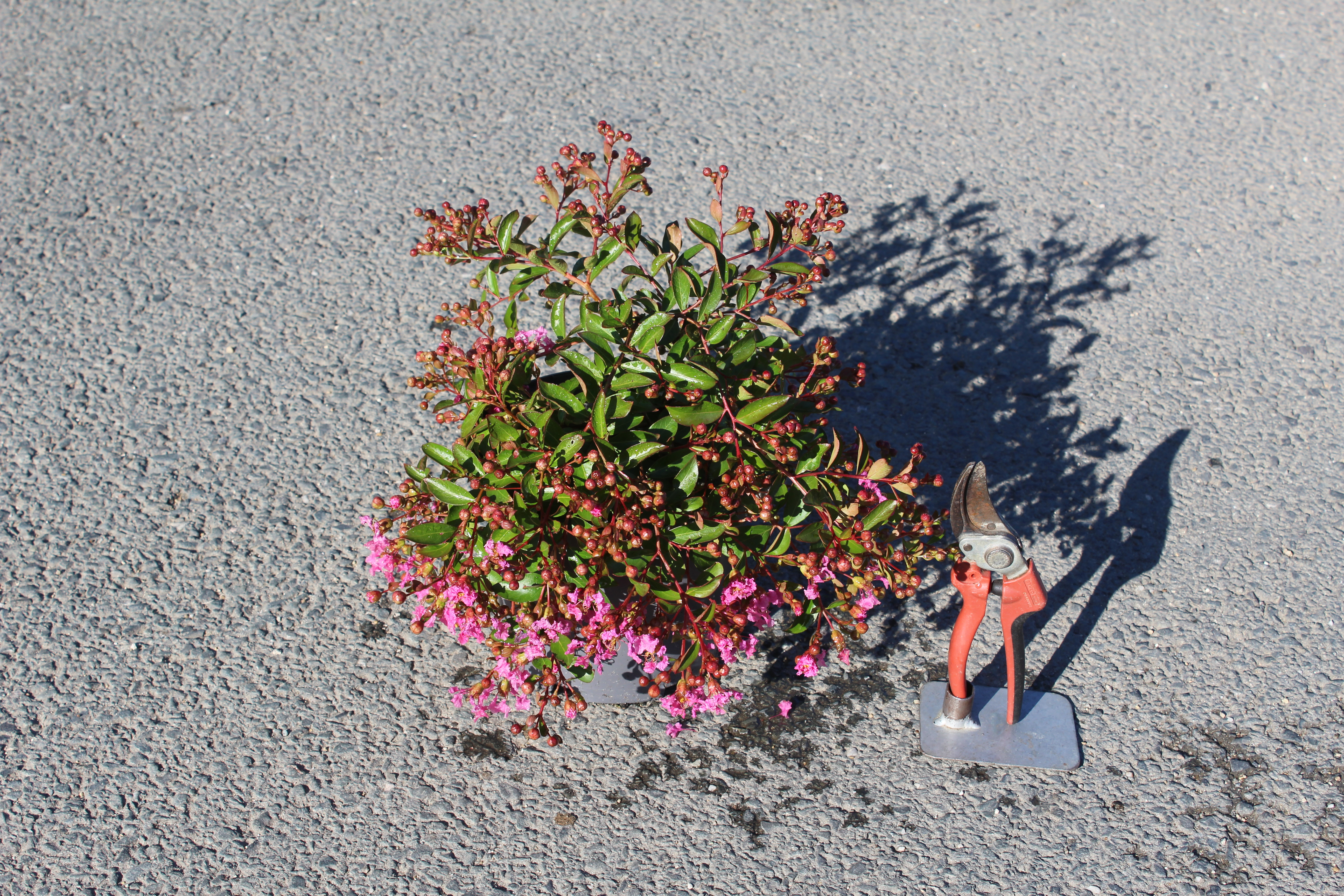 Le Lilas des Indes 'Mimie Rose' (Lagerstroemia indica) est une variété naine unique par son architecture. Contrairement aux Lilas des Indes classiques qui poussent en hauteur, 'Mimie' adopte un **port pleureur et étalé**. Ses branches souples retombent gracieusement, se couvrant de grappes d'un **rose bonbon éclatant** tout l'été.