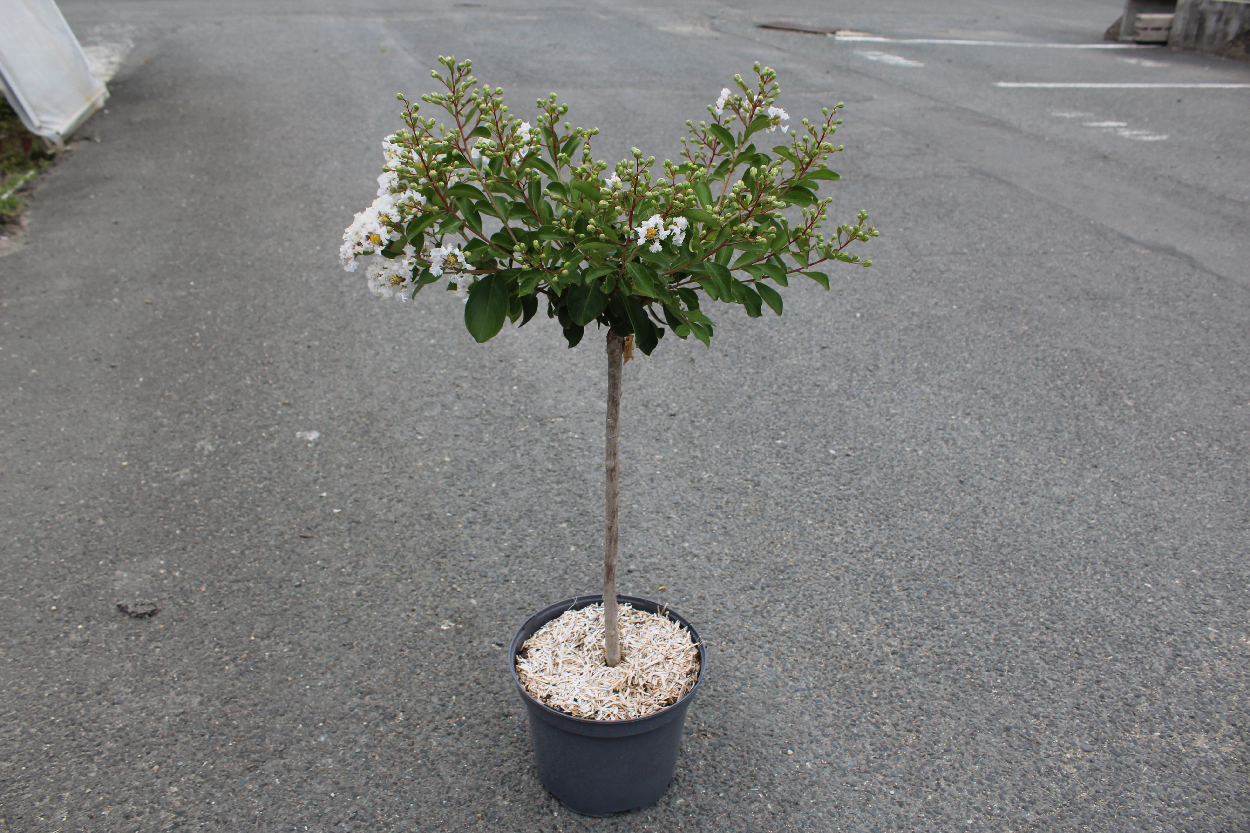 Le Lilas des Indes 'Pixie White' (Lagerstroemia indica) est une véritable merveille pour les petits espaces. Cette variété naine se distingue par son port extrêmement compact et sa floraison estivale spectaculaire. De juillet à septembre, il se couvre de grappes de fleurs d'un blanc pur immaculé, dont les pétales délicatement froissés captent la lumière avec élégance.