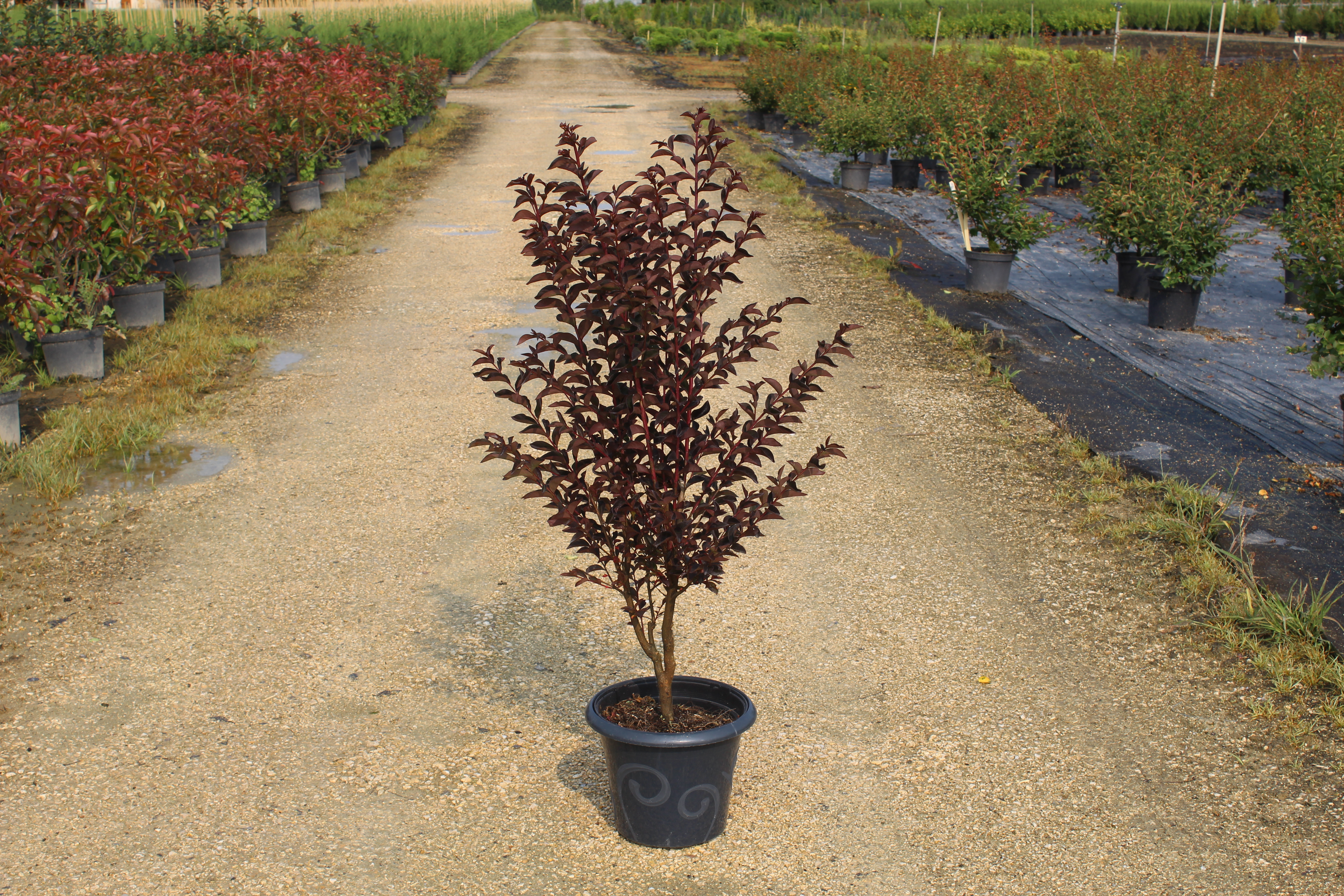 Pouvant atteindre 2 à 4 mètres de hauteur, cette variété présente une silhouette compacte et érigée. Son feuillage pourpre très sombre offre un contraste saisissant avec les inflorescences en panicules rose pastel, presque coquille d’œuf. En plein été, en août, il déploie une floraison dense et généreuse qui attire les abeilles et les papillons, enrichissant la biodiversité du jardin.