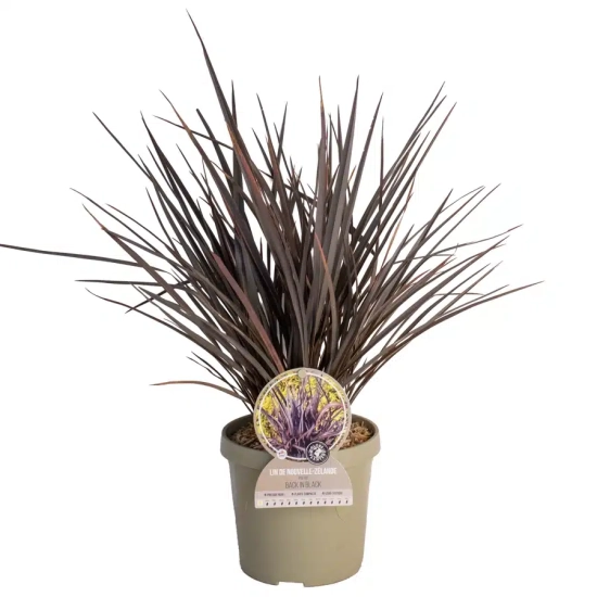 Idéale en tant que plante d’ornement, le Lin de Nouvelle-Zélande 'Back in Black' peut servir de point focal, de brise-vue ou d’élément structurant dans les jardins contemporains. Il s’intègre parfaitement dans des massifs variés, des jardins aquatiques ou même des ambiances méditerranéennes. Vous pouvez aussi le cultiver en pot, ce qui le rend parfait pour les balcons ou terrasses. Sa couleur graphique et sa structure résistante en font une excellente option pour ajouter de la texture et du contraste à votre espace extérieur. Idéal associé au Lin De Nouvelle Zelande Platts Black Phormium Tenax Platts Black et au Lin De Nouvelle Zelande Rainbow Sunrise Phormium Tenax Rainbow Sunrise pour composer un décor cohérent au fil des saisons.
