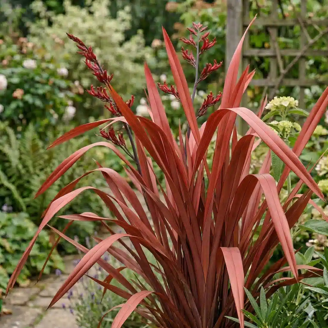 Le Phormium 'In the Red' est une plante vivace d'exception, plébiscitée pour son feuillage architectural d'un rouge pourpré intense. Ses longues feuilles coriaces, en forme de lances érigées, apportent une verticalité immédiate et une touche d'exotisme moderne à tout aménagement paysager. Persistant et graphique, il conserve ses couleurs flamboyantes tout au long de l'année, offrant un spectacle permanent même au cœur de l'hiver.