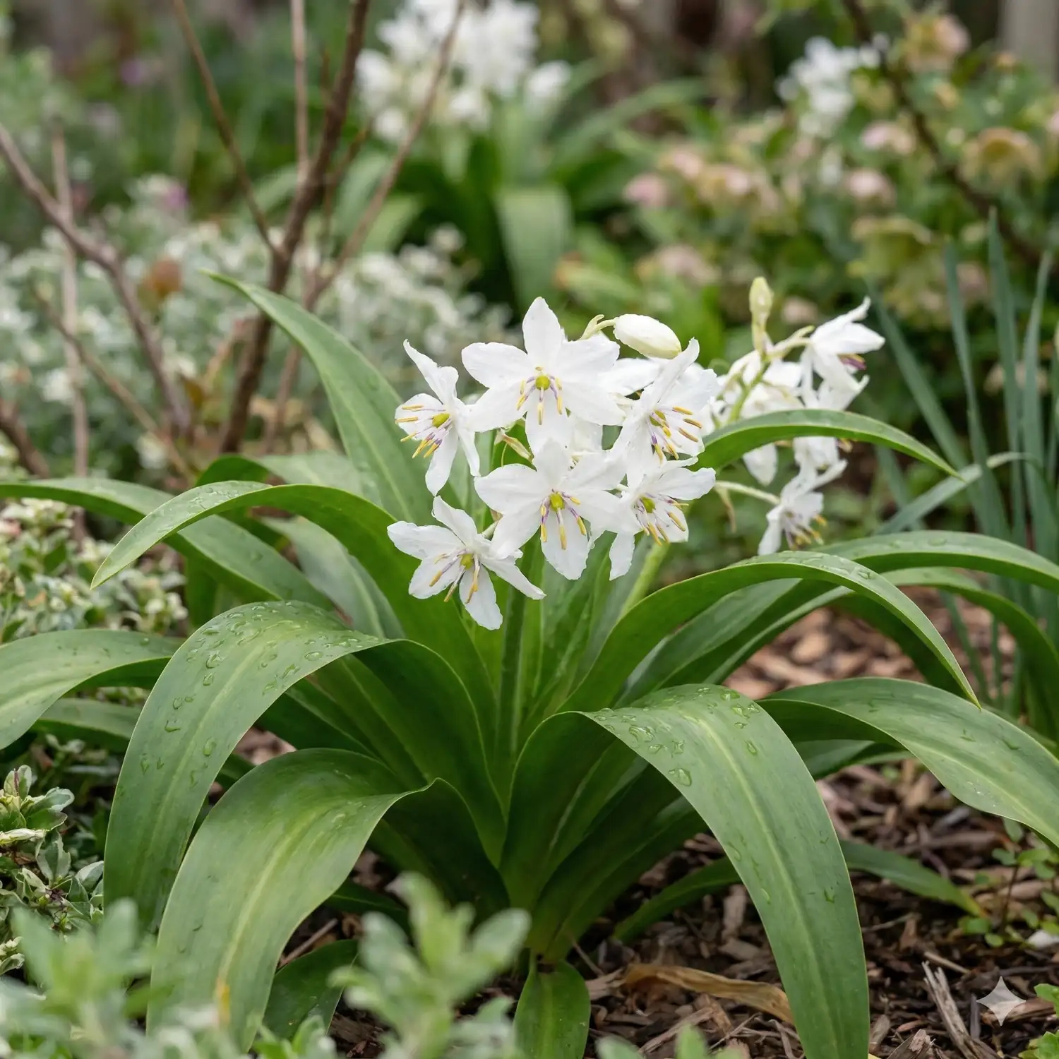 Formant une belle touffe de feuilles larges, arquées et d'un vert tendre (rappelant l'allure d'un petit hosta ou d'une agapanthe à feuilles larges), il apporte une indéniable touche exotique et luxuriante. La grâce aérienne de sa floraison blanche et la générosité de son feuillage rubané sont d'ailleurs idéalement mises en valeur par des photographies au format carré, parfaites pour illustrer sa délicatesse sur votre catalogue en ligne. Découvrez notre collection complète de plantes vivaces rares et originales sur ma-pepiniere.fr.