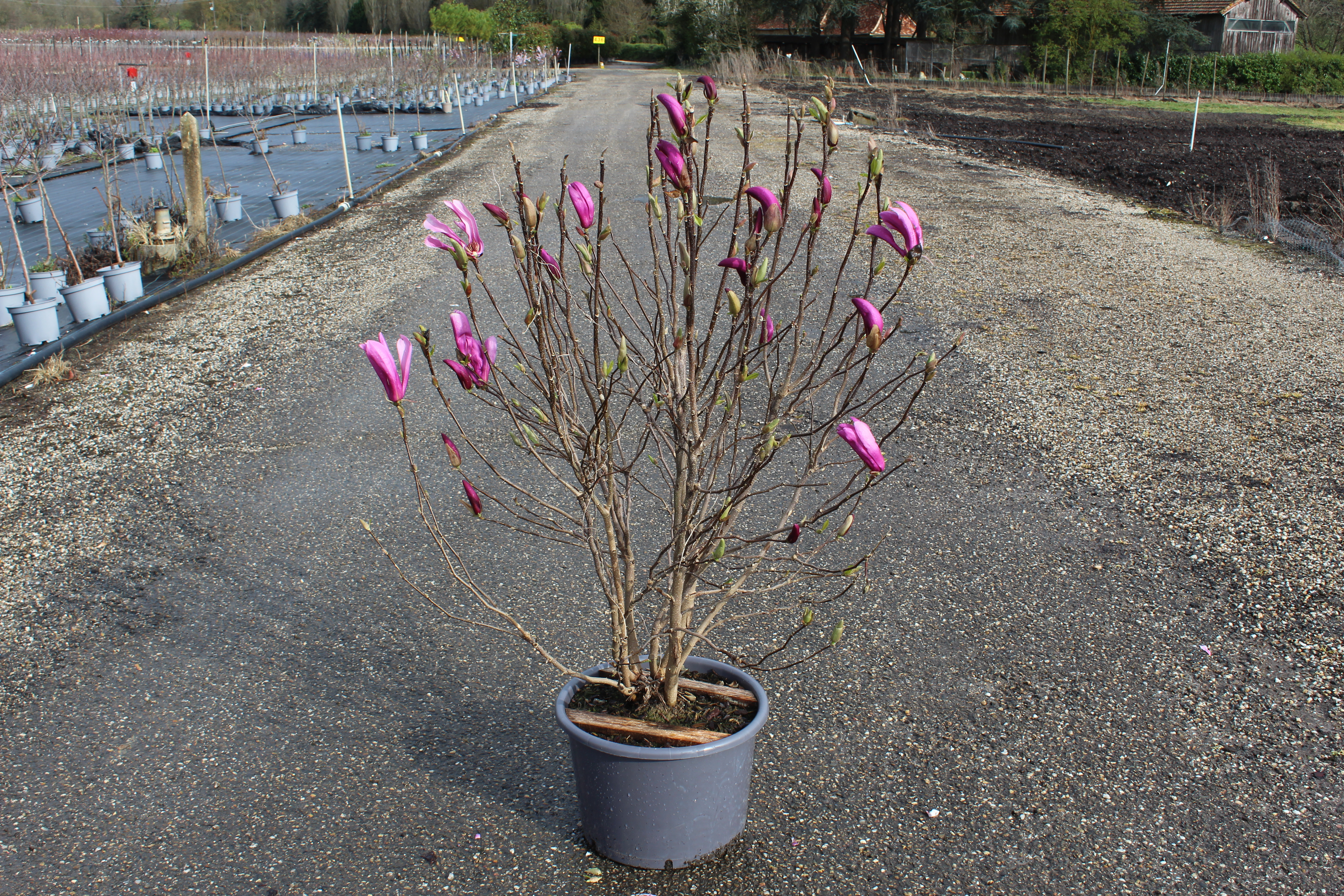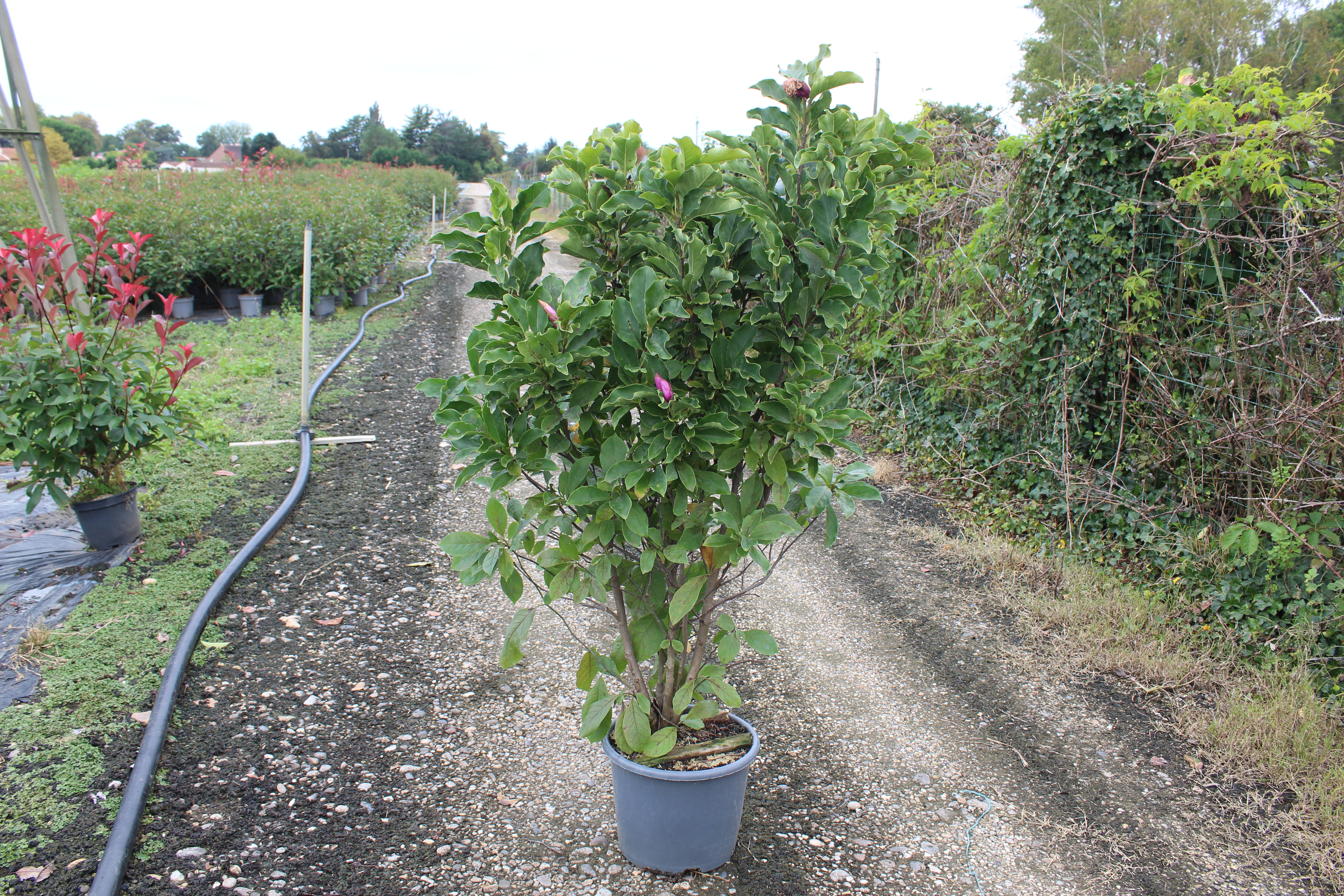 Le Magnolia 'Susan' est une plante remarquable qui attire l’attention des jardiniers passionnés grâce à sa floraison unique et à sa beauté. Cette variété de magnolia, qui fait partie de la famille des Magnoliacées, est particulièrement appréciée pour ses fleurs en forme de coupe qui s'épanouissent au printemps. Les fleurs du Magnolia 'Susan' sont d'un rose foncé, parfois presque violet, et dégagent un parfum subtil qui charme quiconque s'approche. Ces caractéristiques font de ce magnolia un choix de prédilection pour ceux qui souhaitent ajouter une touche de couleur et de fragrance à leur jardin.