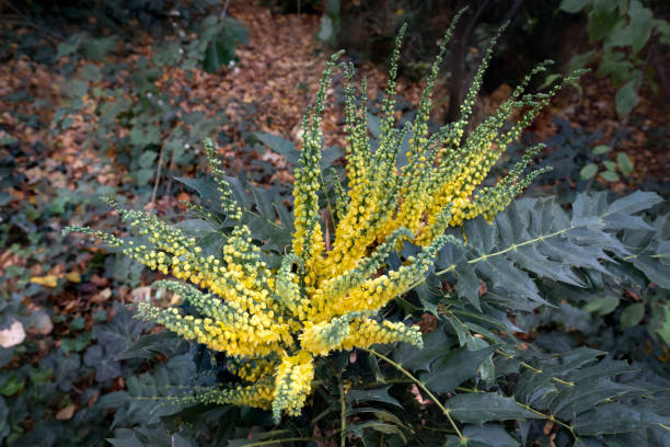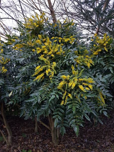 La floraison du Mahonia 'Winter sun' est l'un de ses atouts majeurs. Des grappes de fleurs jaunes éclatantes apparaissent généralement en hiver, souvent de décembre à mars. Ces fleurs, au parfum délicat et enivrant, attirent de nombreux pollinisateurs, notamment les abeilles, ce qui en fait une plante bénéfique pour la biodiversité. La floraison précoce du Mahonia 'Winter sun' en fait un table de choix pour égayer le jardin pendant les périodes froides. Les fleurs sont suivies de baies bleu-noir qui, bien qu'eux-mêmes non comestibles pour l'homme, offrent un festin pour les oiseaux.
