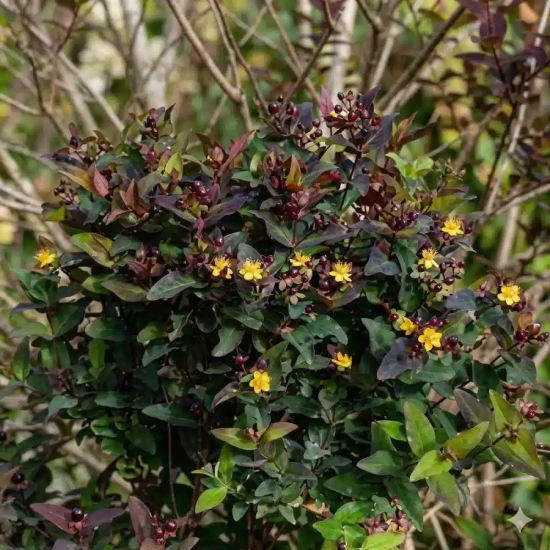 Dès le mois de juillet, le Millepertuis 'Night' s'anime. Ses fleurs riches en étamines attirent de nombreux pollinisateurs. Une fois la floraison passée, ses baies sombres deviennent une source de nourriture précieuse pour les oiseaux à l'automne. Sa résistance naturelle aux maladies et sa sobriété en font une plante de choix pour les jardins écologiques et les espaces nécessitant peu d'entretien.