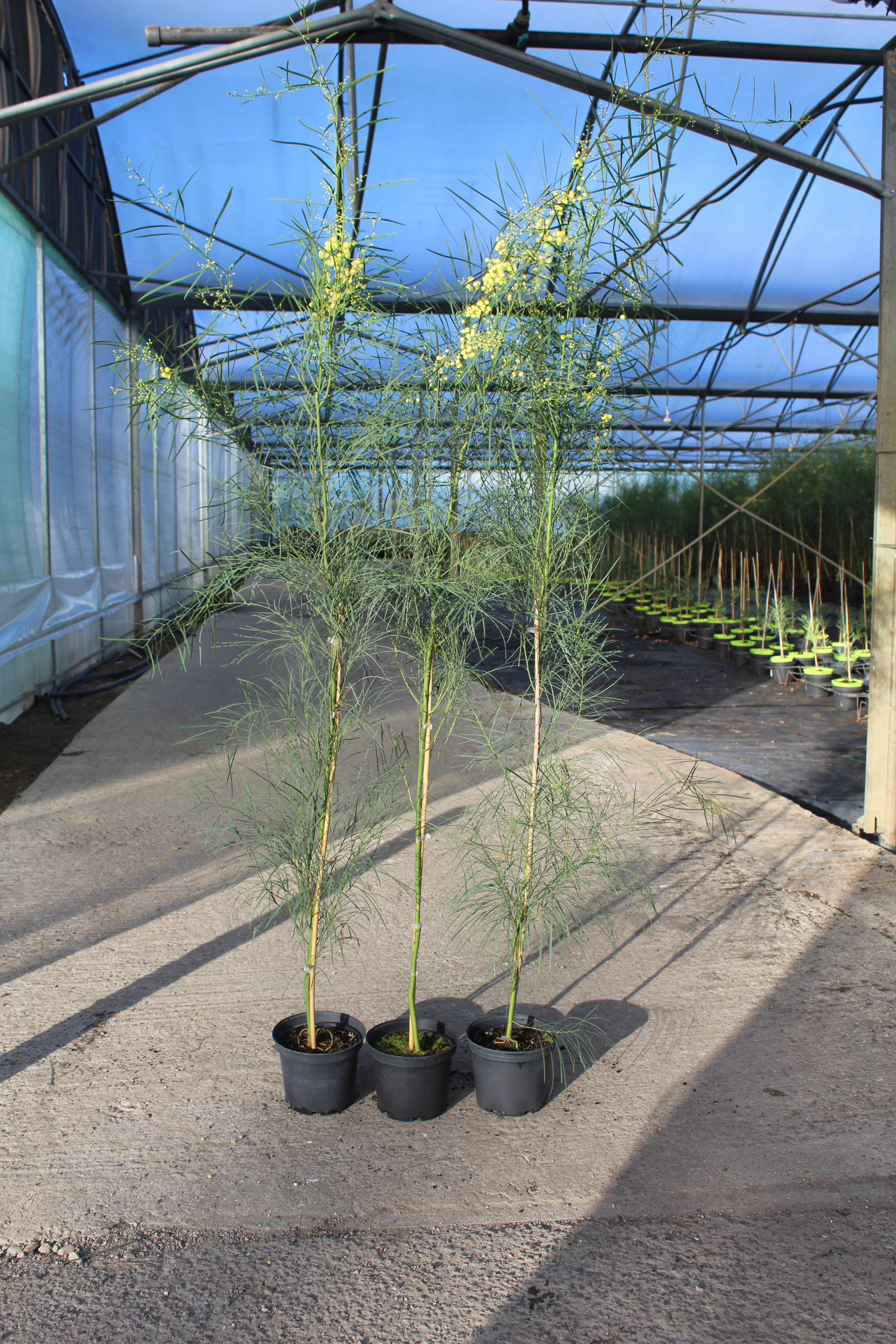 - Feuillage : persistant, phyllodes (fausses feuilles) allongées, vert à vert bleuté, très fines et souples.