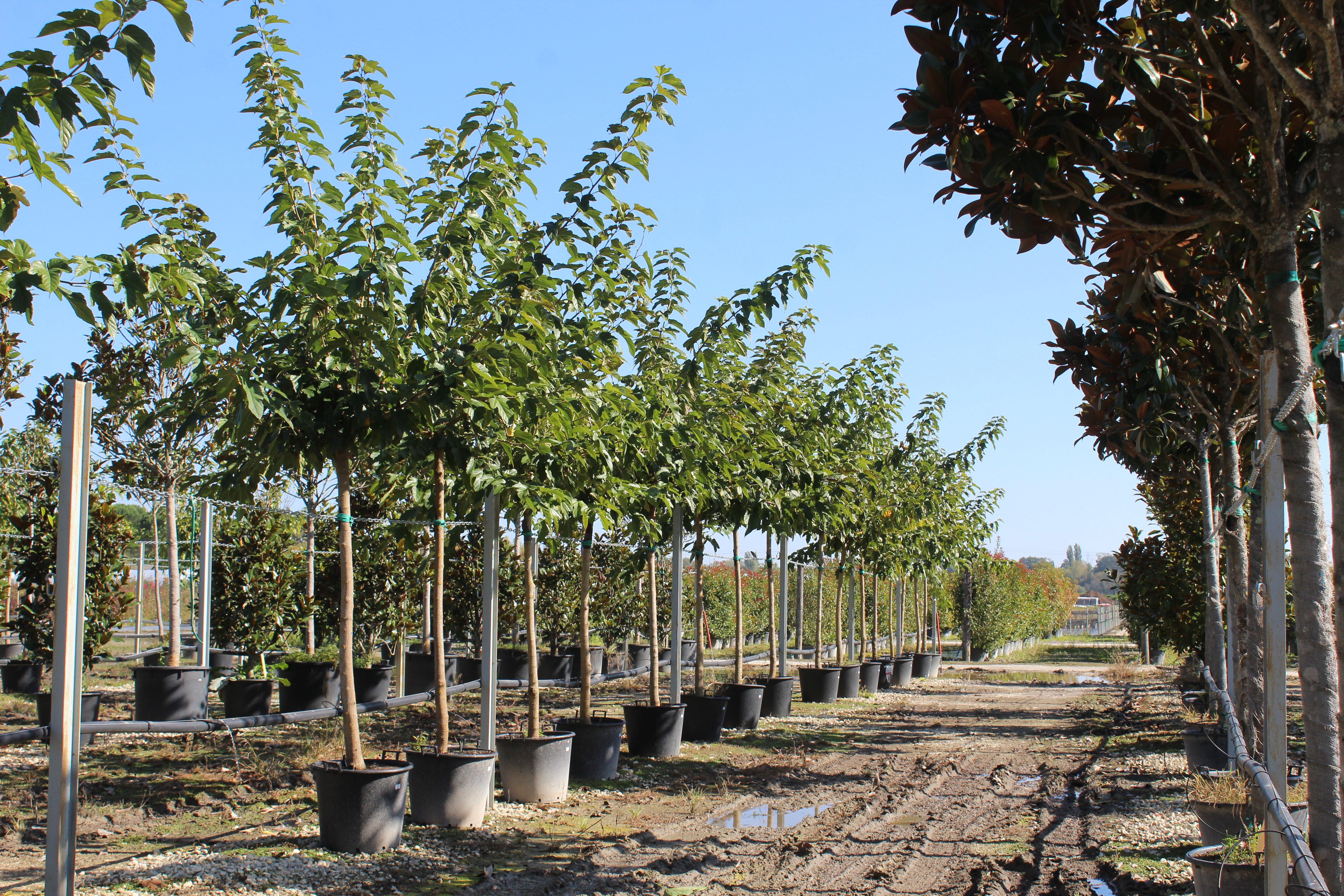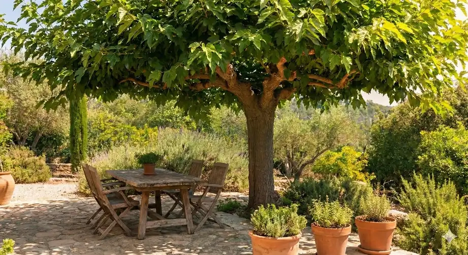 Choisi pour créer une ombre naturelle « habitable », il remplace avantageusement une pergola sur petites terrasses. En bord de piscine, il offre une couverture dense sans fruits. En milieu urbain, il tolère la chaleur minérale et la réverbération. Associez-le à des vivaces sobres : Lavandula, Perovskia, graminées (pennisetum, stipa), cistes et romarins, pour un esprit méditerranéen facile à vivre.
