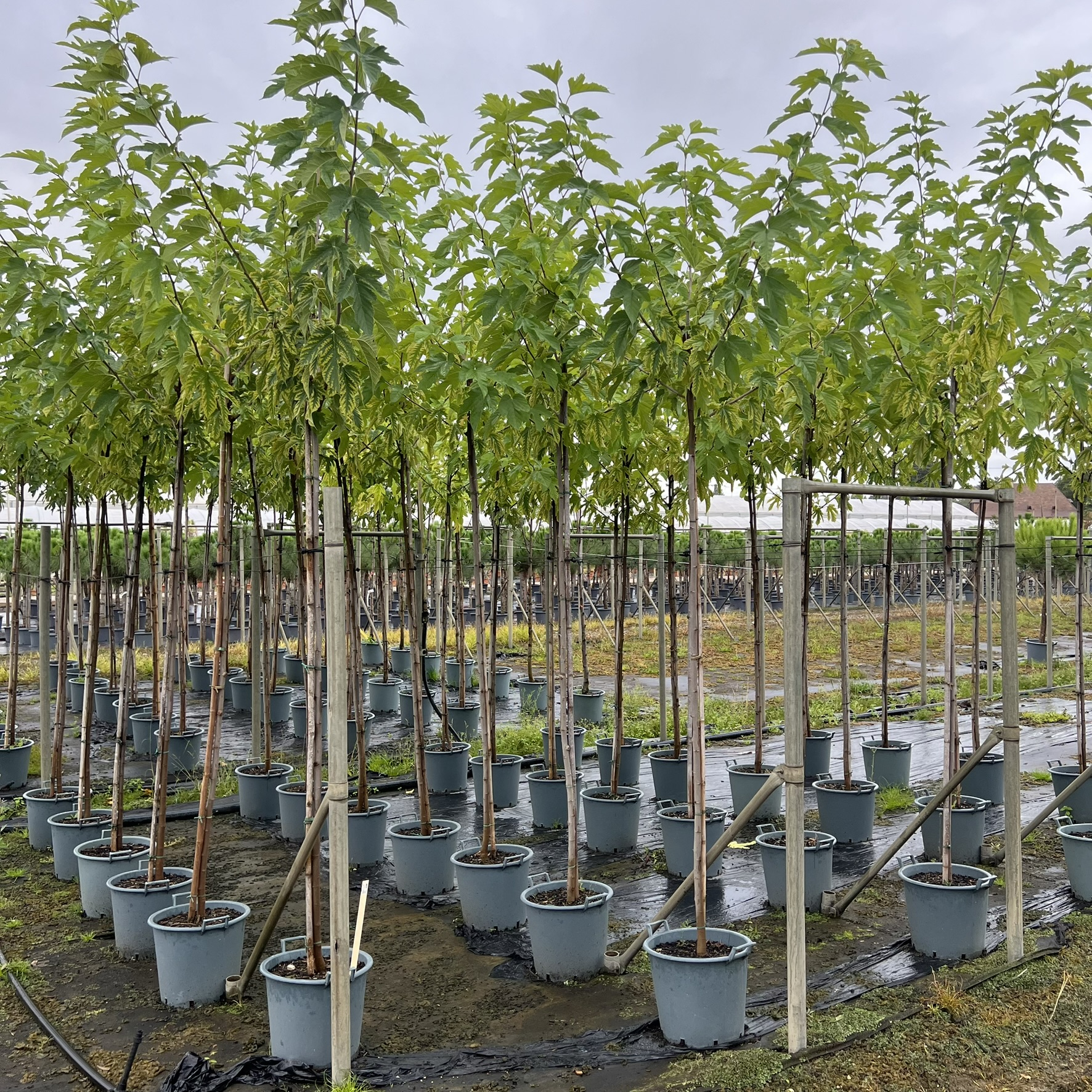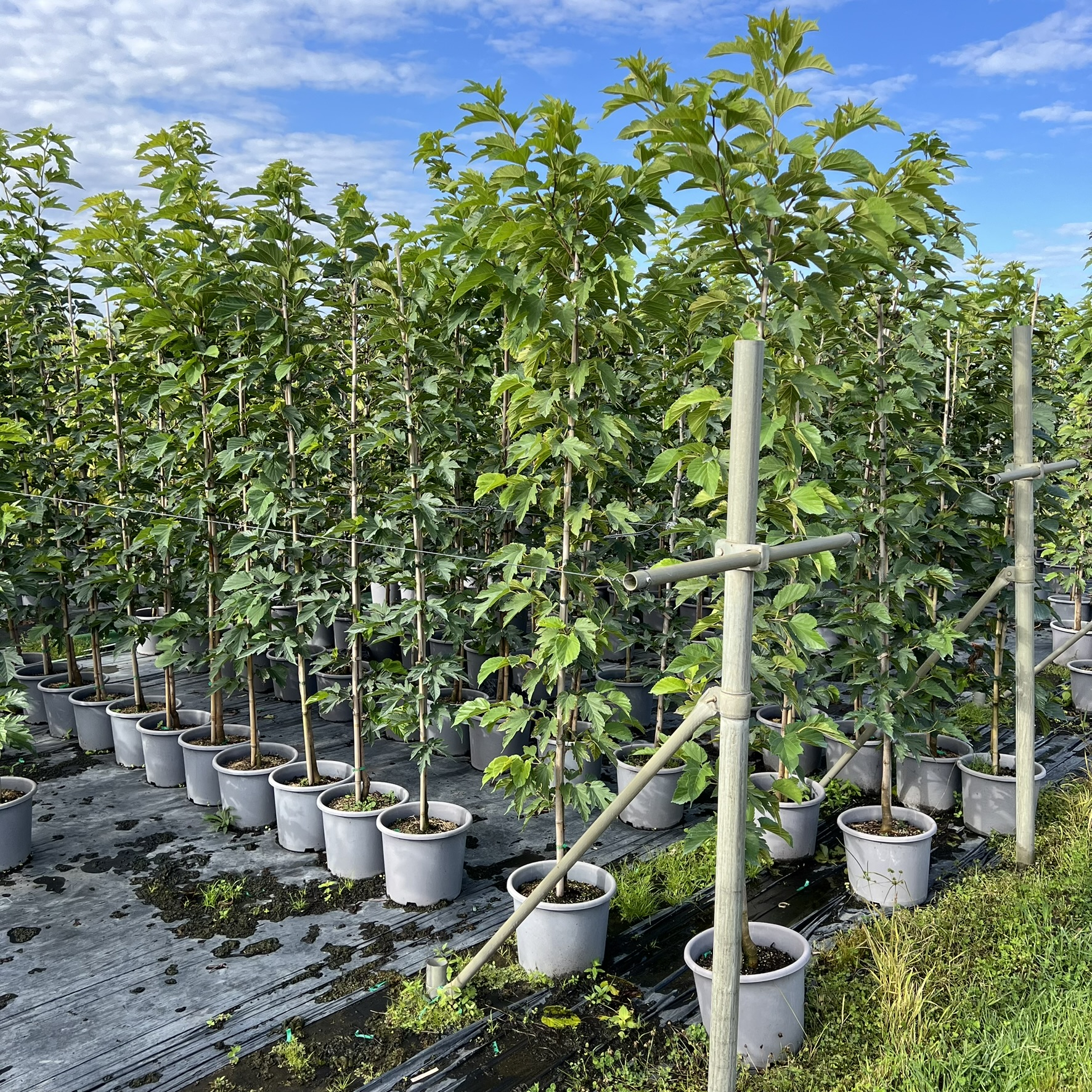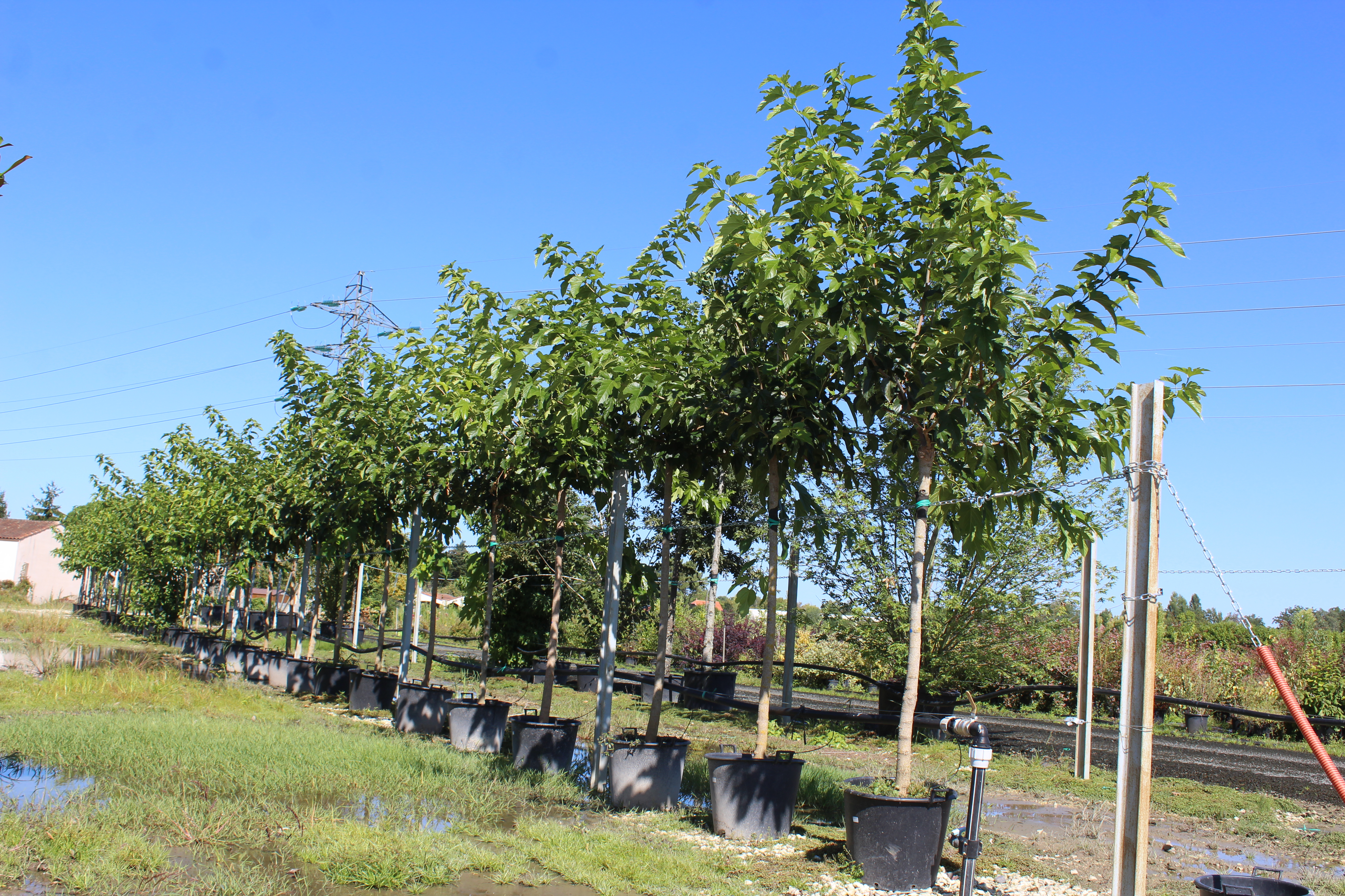 Le mûrier platane sans fruit “Morus kagayamae” est un arbre caduc au feuillage très large, proche du platane par l’aspect de ses feuilles palmées. Sélectionné pour ne pas fructifier, il évite les salissures sur terrasses, allées ou parkings. Son port naturellement arrondi, parfois conduit en forme « parasol », offre une ombre dense dès les premières années. On l’apprécie pour sa robustesse, sa tolérance à la chaleur et sa capacité à s’adapter à de nombreux sols, même calcaires et secs une fois bien installé.
